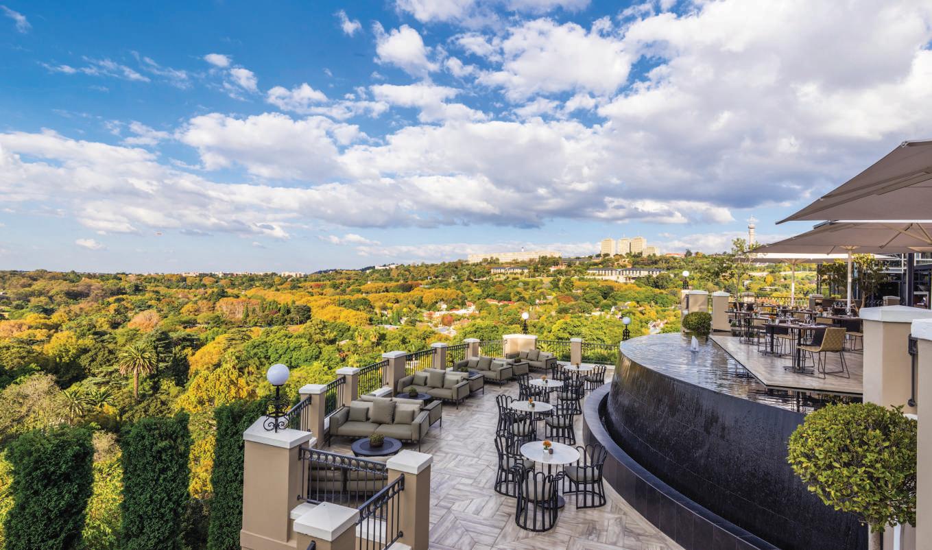 nooks and crannies, some with sensational views. The hotel, though, is a landmark, not only because of its elevated location, but also its tradition of warm hospitality that has long made it a favourite hang-out among Joburg residents who come for sundowners with views that never disappoint. For a daytime kick, there’s a sumptuous high tea that’ll knock your socks off –particularly if you arrange a helicopter flip and wash down the experience with pastry chef Nathan Jacobs’s tower of sweet pastries and savoury treats, served with a choice of teas and tisanes. And bubbly, too, of course. From beef short rib amagwinya and flaky mushroom empanadas to hazelnut and blackberry financiers and cassis and white chocolate vacherins, Jacobs has a knack for channelling scrumptious flavours into bite-size mouthfuls and luxury finger sandwiches. No matter what’s on the menu, included are the rather surreal bird’s-eye views of the leafy neighbourhoods below. fourseasons.com/Johannesburg/