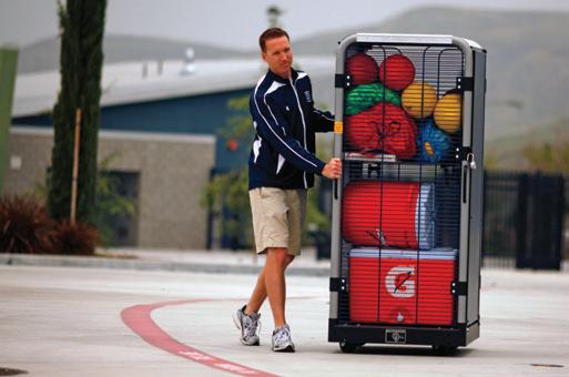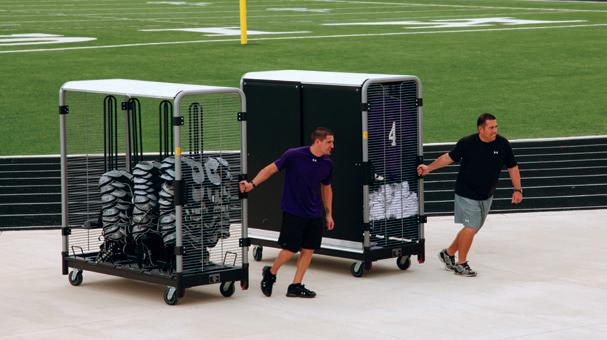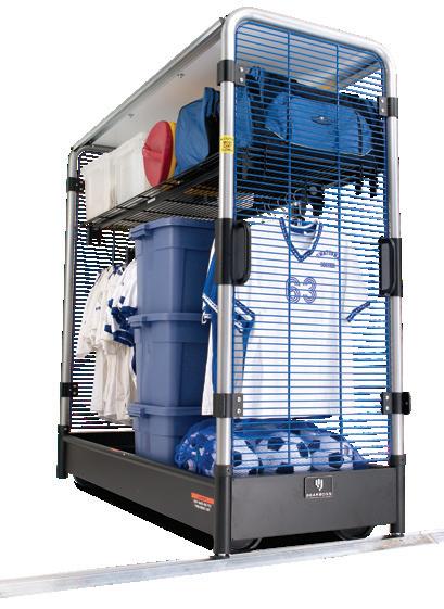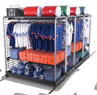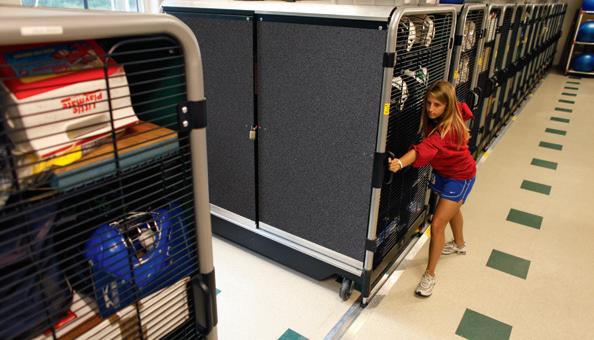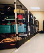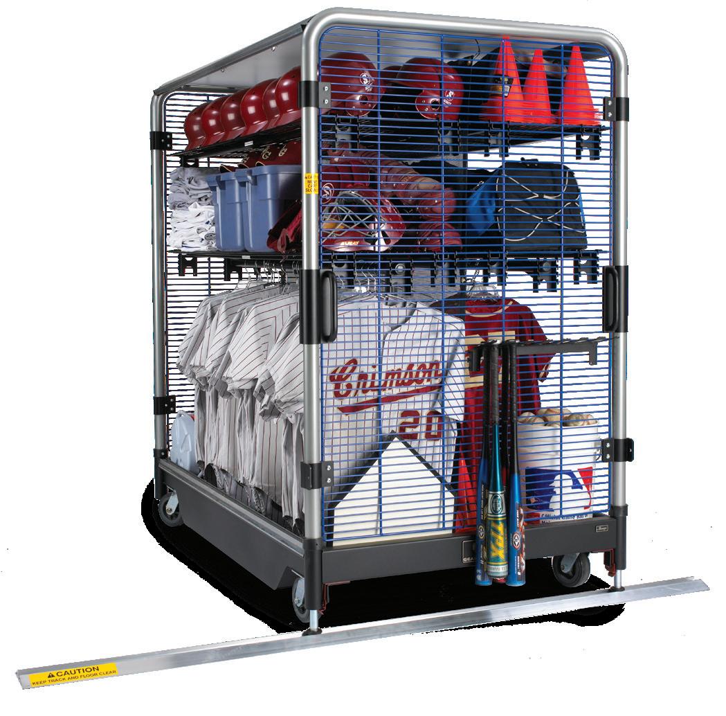 A rugged, high-density, secure athletic storage system that slides on a floor track. It’s a huge space saver when you consider the space eliminated by removing aisles between carts.