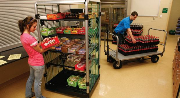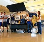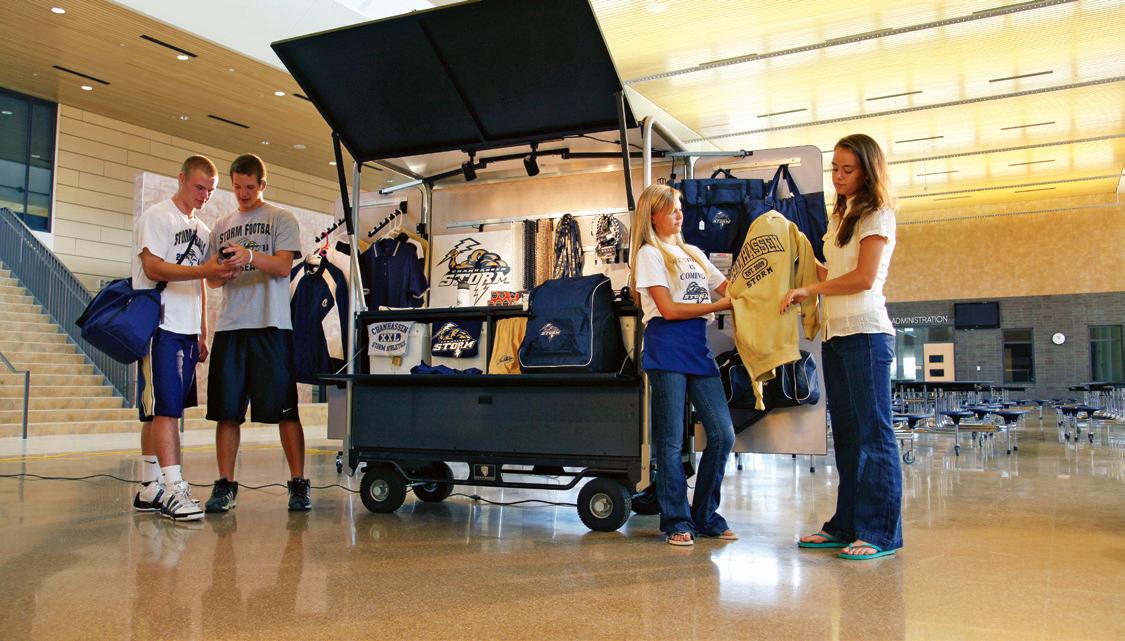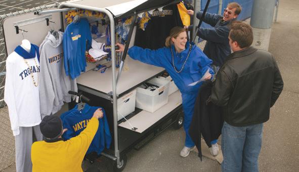 All of your logo gear is neatly secured inside the enclosed unit every time you move. The kiosk sets up in minutes. Eight removable bins allow different athletic programs, boosters or school clubs to keep inventory in their own bin. Great around stadiums, gyms, concerts and community events. The perfect solution for daily sales in high-traffic areas.