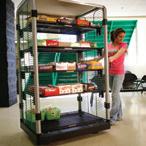 More shelves and options for hanging bars and lock boxes can be added at any time. Work surfaces can be added to create repair benches, pass-through stations and even desks.