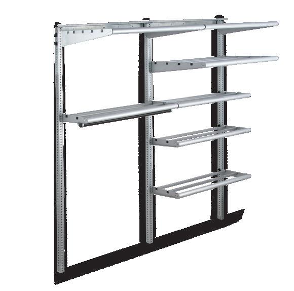 4 MULTIPLE OPTIONS TO CONFIGURE YOUR SYSTEM INCLUDING WORK SURFACE, DRAWERS, GARMENT BARS AND HANGERS.