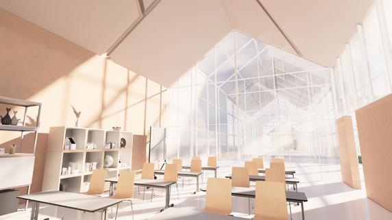 Horizontal bi-fold function as awnings when opened, seamlessly extending the hall into the outdoors. This allows students to engage with the community and actively participate in selling at the farmers market. closed opened