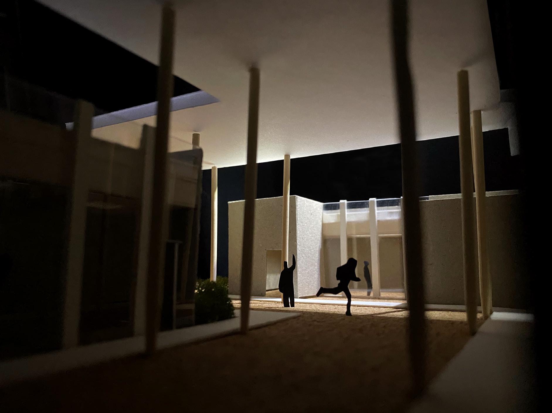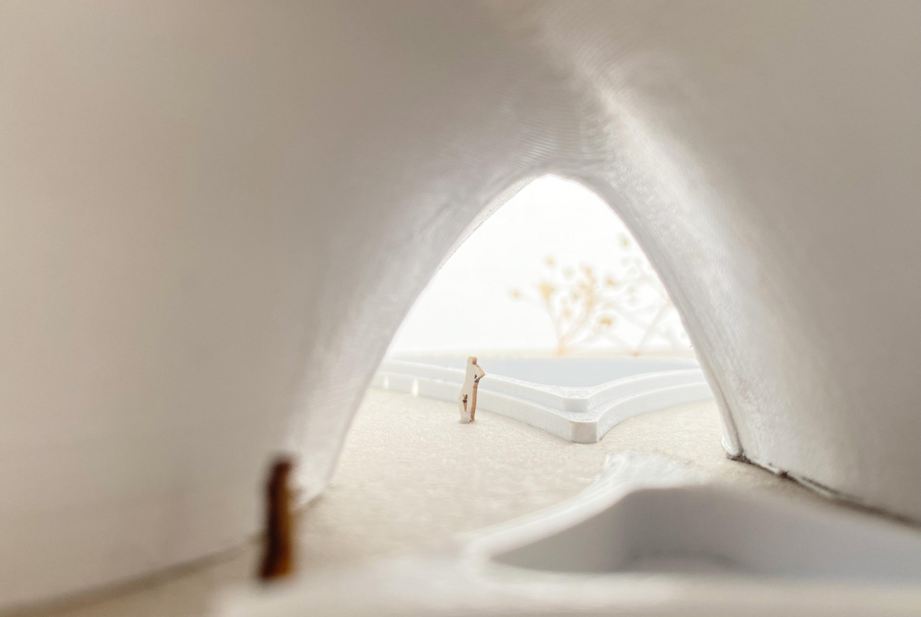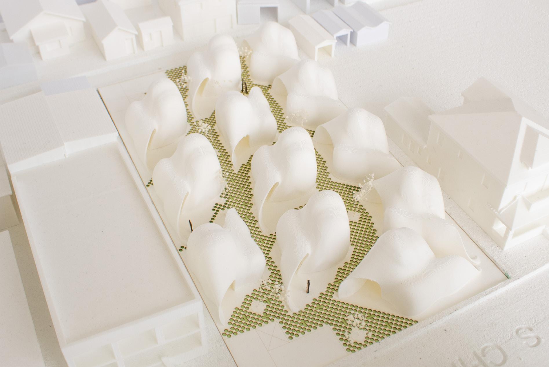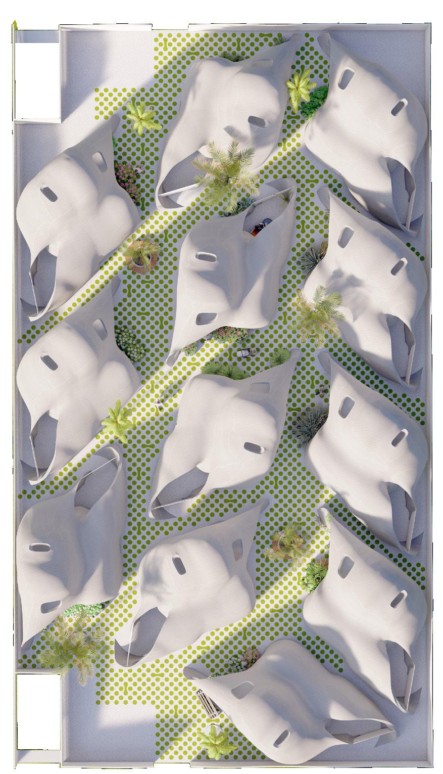 This project proposes a different perception of affordable housing communities from the buildings’ form to the curvilinear site grid. Considering how 3D printed housing is still a new and ongoing concept, I challenged myself to test the limits of 3D printed technology by using subdivision surface modeling, or SubD, in designing the organic shell-like forms to maximize the sense of spaciousness and individuality within the homes. The tiny homes are easily personalizable, with 450 sq. ft of living space inside and an additional built-in outdoor space that can become a second “living” space. The interwoven circulation of the neighborhood also brings inhabitants through unique paths and to different pockets of activity, fostering a sense of privacy and individuality even outside of the home.