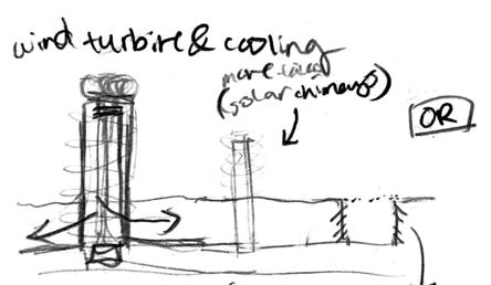 The generators for each windtower connects through the tubes to the basement level where the main mechanicals are. The interior couryards add natural lighting in and helps facilitate cross ventilation to balance the air brought in by the windtowers.