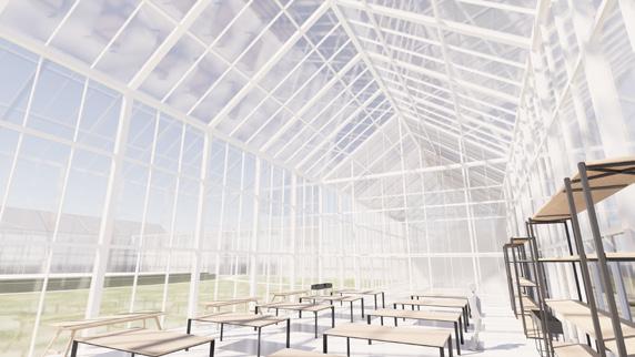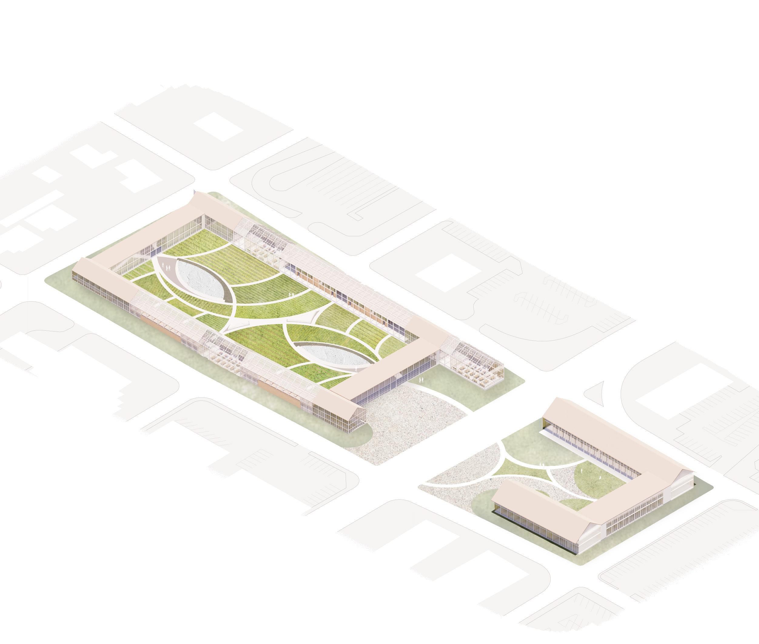 horizontal bars added for safety for school and separates the school from the urban site bars are stretched at diff sizes at ends- to imply an end of the street & the shape formed is part of our extension of the farmer’s market- natural progression from the farmer’s market program- priv anchoring the back where main employee entrance is, middle is classrooms/greenhousesmore educational and also right behind the crops, more social spaces- cafeteria/lib anchoring the front introduction of crops and greenery to the site