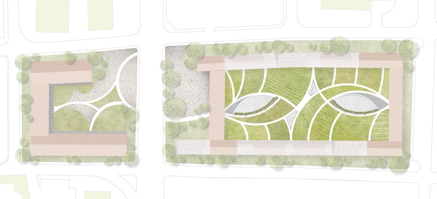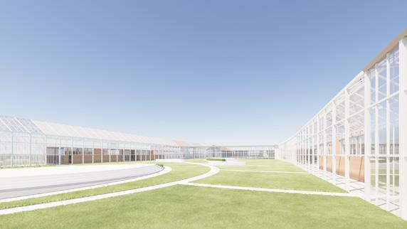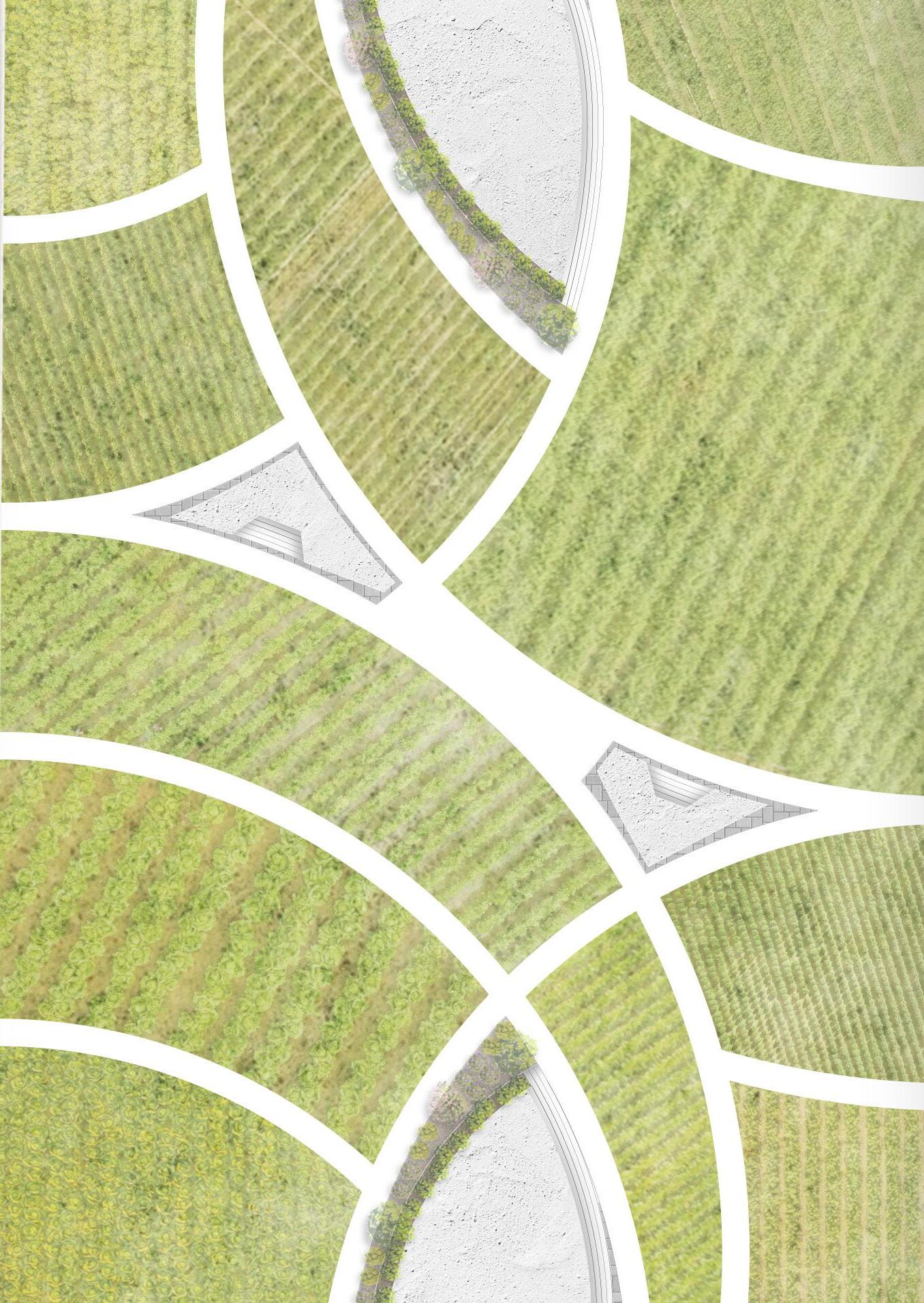 Landscape paths features a network of curvilinear paths formed by a series of overlapping circles that aligns with natural “desire” paths. These pathways weave through the crops, connecting all building entrances and openings.