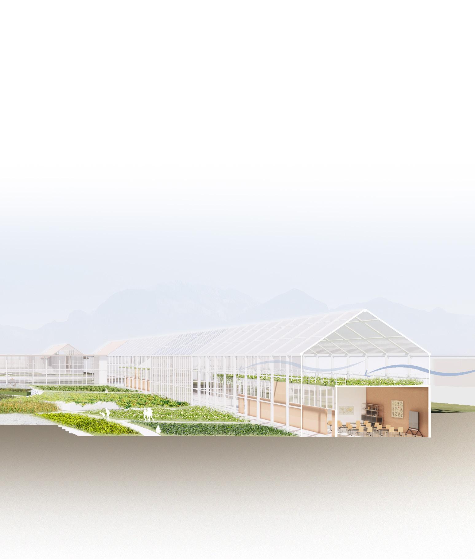 - program- priv anchoring the back where main employee entrance is, middle is classrooms/greenhousesmore educational and also right behind the crops, more social spaces- cafeteria/lib anchoring the front - introduction of crops and greenery to the site