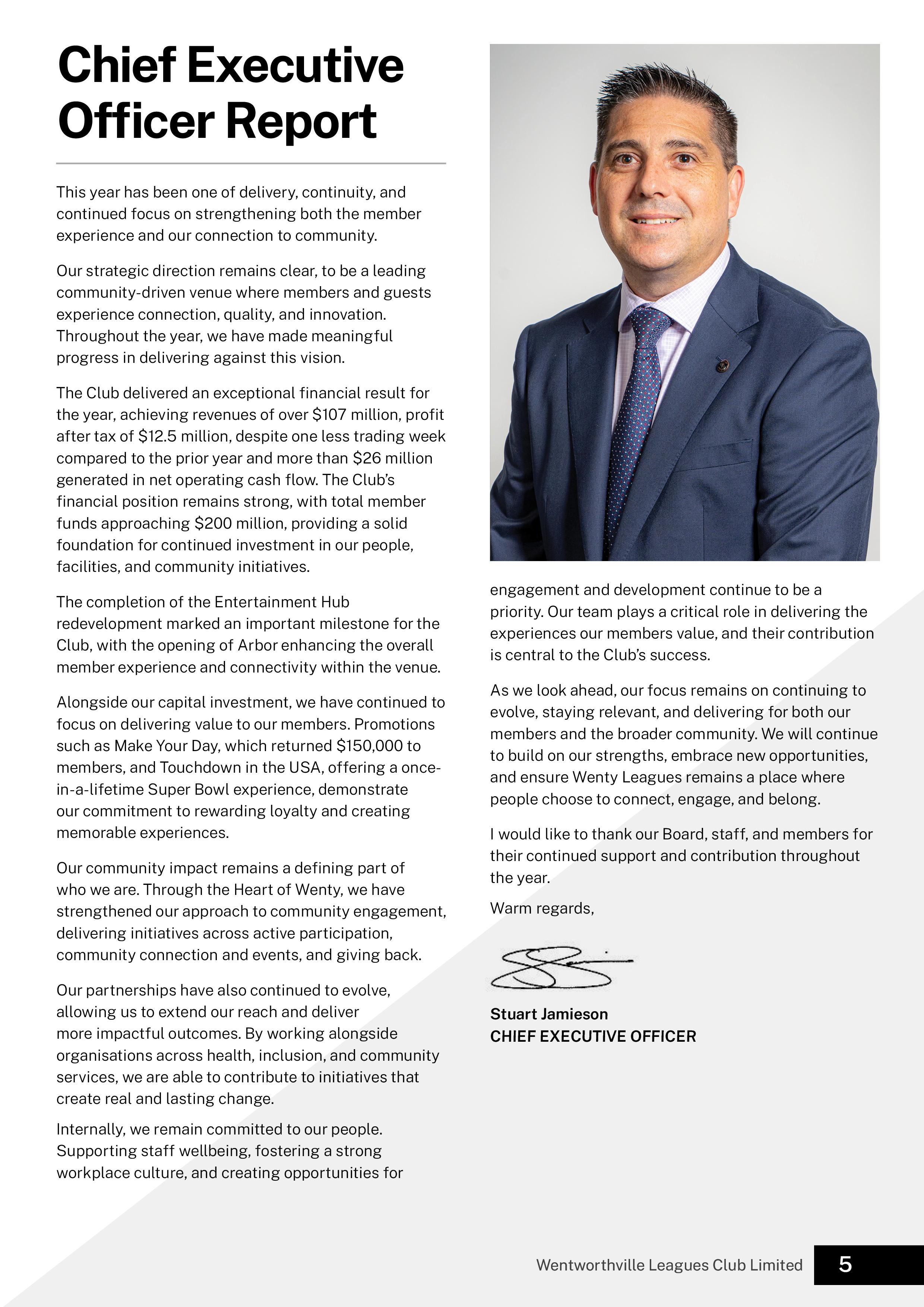 would like to thank Glenn for his contribution and leadership during this time. We are pleased that Stuart Jamieson has stepped into the role of Chief Executive Officer, providing continuity and strong leadership as the Club continues to progress its strategic priorities.