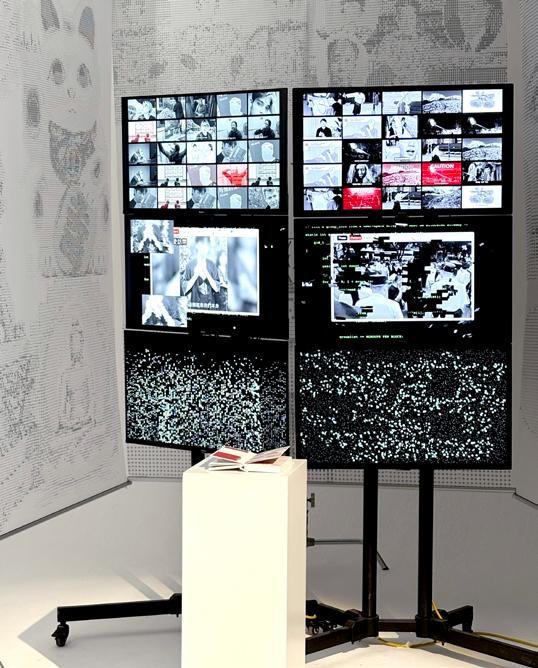 Three warp-knitted fabrics printed with ASCII images enclose a 2.5㎡ space, inside which the handbook and six video screens are placed.