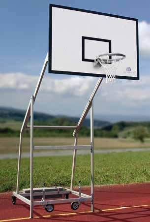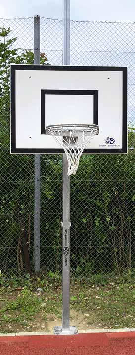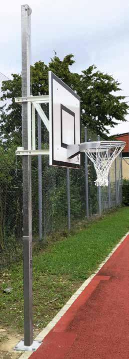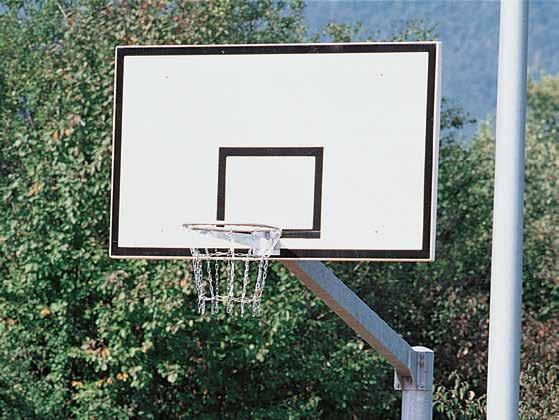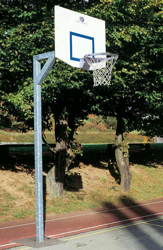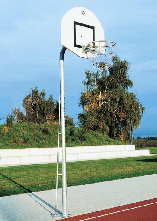 Feuerverzinkte Basketballanlage mit Rechteckbrett zum Aufschrauben auf den Bodenrahmen (Hülsenrahmen Art. Nr. 105.2.040). Inkl. demontierbarem Tragarm und Basketballbrett 180 x 105 cm aus Vollholzkern und wetterfester GFK-Beschichtung, weiss mit schwarzer Markierung. Korb und Netz nicht im Lieferumfang. Korbhöhe: 305 cm. Mast Ø 16 cm. 720.1.278 Ausladung 165 cm