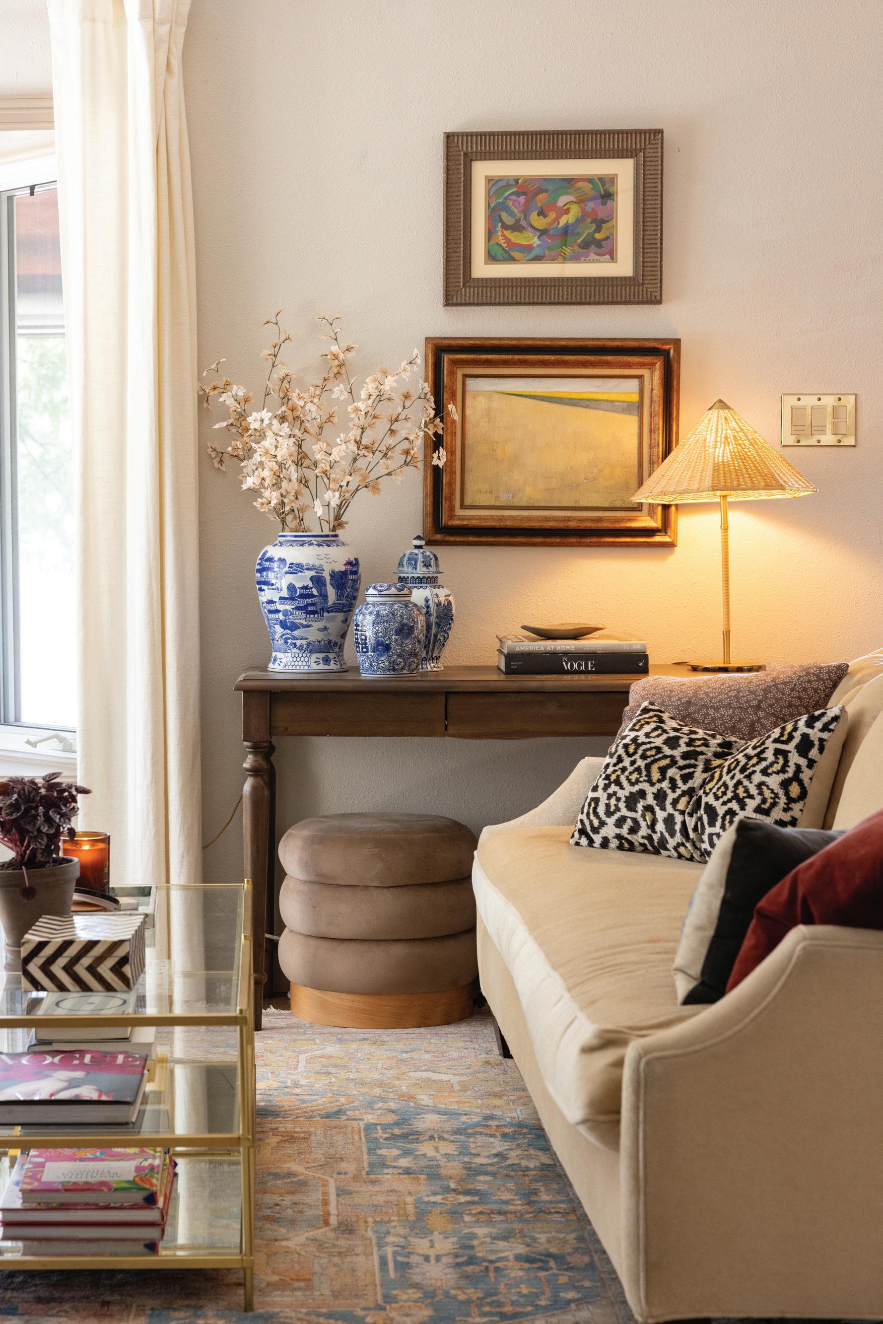 Budget-friendly choices kept the project accessible. She sold old furniture, repurposed pieces she already owned, and patiently scrolled through Amazon for just-right finds. The final touches included meaningful art collected from travels and dog portraits, plus pillows with sentimental backstories.