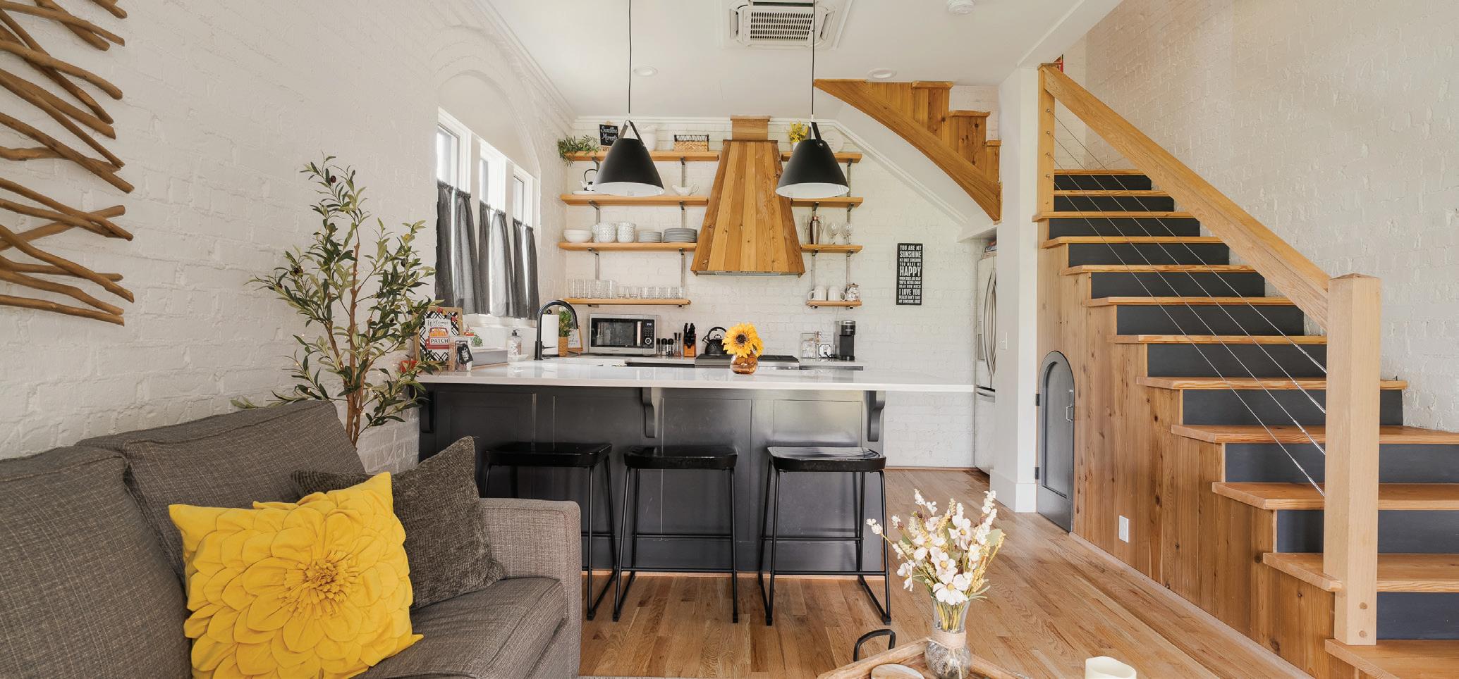hauled away their brand-new plumbing fixtures. “Never a dull moment!” they laugh. Through it all, they credit their team: Edgar �uintero of �uincast Construction kept crews on site daily, designer Suzanne Priebe of Grace Ryan guided finishes and even lined up backup subcontractors, James Wertz of JTH Carpentry crafted custom beams and railings, and of course, Sarah Riggs navigated every twist and turn of the process. Jon also rolled up his sleeves, building reclaimed wood mantels, hanging window coverings, and tackling small electrical fixes to keep progress moving.