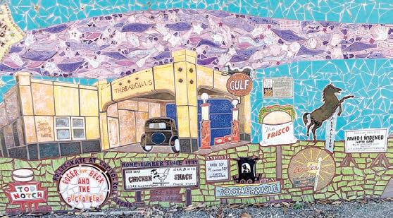 Jean Graham’s cunningly crafted mural pays homage to neighborhood institutions, from the dancing pig, to the two founders and their Oldsmobile, to the still thriving Crestview Shopping Center itself. Immortalized are Lala’s with its proud pink poodle, the Chief Drive-In Theatre, Top Notch Hamburgers, and Theadgill’s, where the seeds of the Armadillo World Headquarters were sown. A wavy violet river runs throughout.