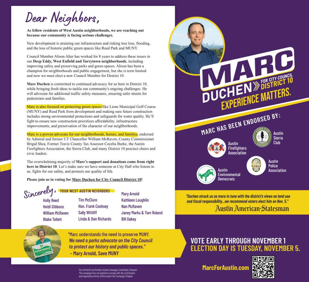 Vote Early through Nov. 1, at several locations in West Austin: (4A)Westminster Presbyterian Church at 3208 Exposition, (4B) Northwest Recreation Center at 2913 Northland Dr, (4C) Riverbend Centre at 4214 N Capital of Texas Hwy, (4D) Ben Hur Shrine Center at 7811 Rockwood Ln, (4E) Randalls Flagship West Lake Hills at 3300 Bee Caves Rd. And on Nov. 5, vote all over Austin wherever you see a Vote Here sign.