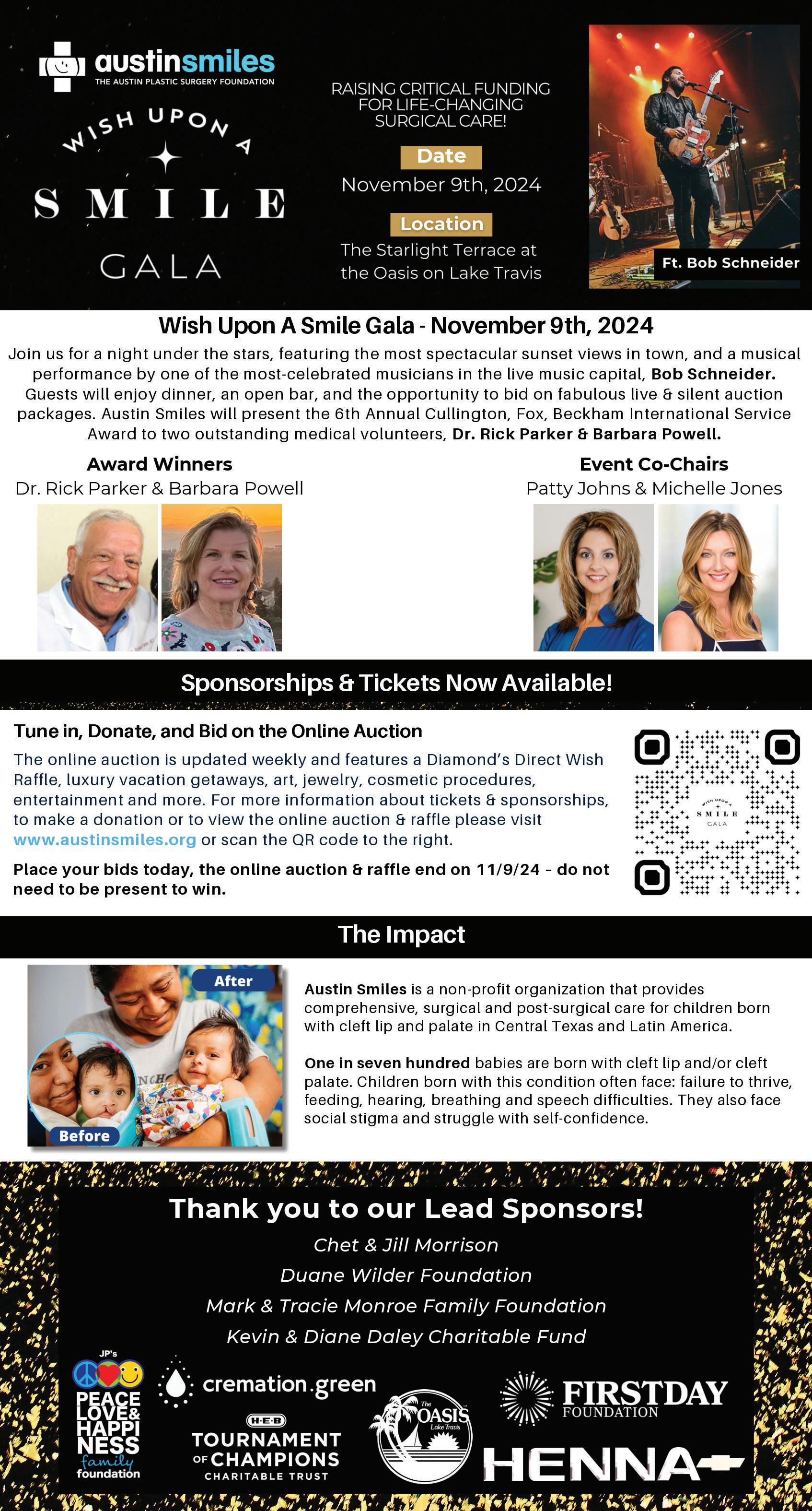 Austin Smiles - The Austin Plastic Surgery Foundation is hosting its 38th Annual Wish Upon A Smile Gala on November 9th at the stunning Starlight Terrace at the Oasis on Lake Travis for an unforgettable evening. The event begins at 5 pm and is dedicated to raising critical funds to support Austin Smiles’ mission of providing surgical and post-surgical care to children born with cleft lip and palate, both in Central Texas and across Latin America. Guests will enjoy the best sunset in town, dinner, an open bar, a live auction and a special performance by Austin’s best, Bob Schneider. This year’s Gala Co-chairs are Patty Johns and Michelle Jones. The event will be emceed by Allison Miller from CBS Austin and Victoria Pineda will return as the Auctioneer.