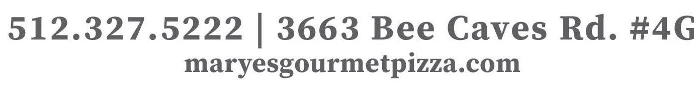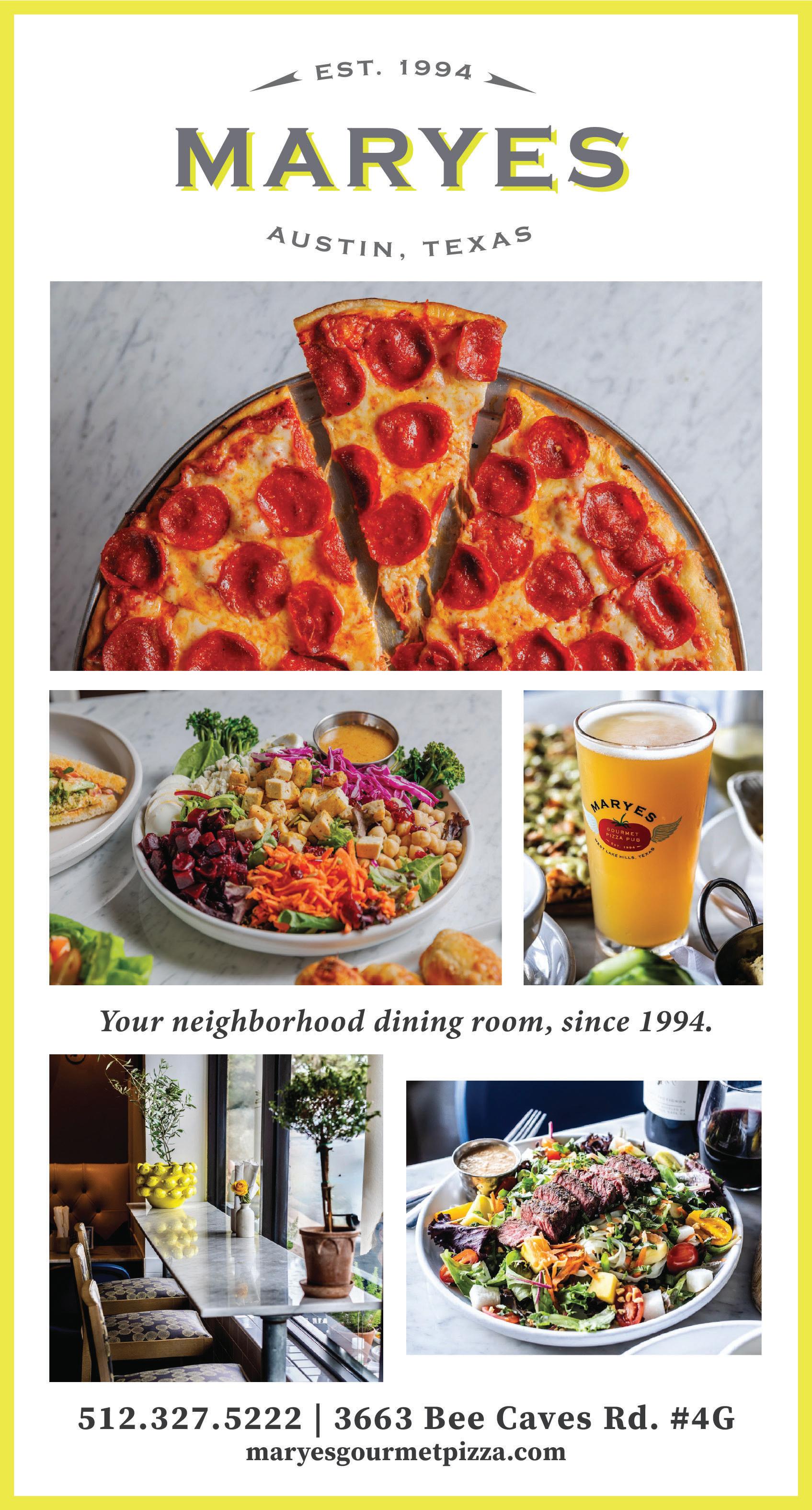 Maryes Gourmet Pizza Pub is celebrating 30 years of business at 3663 Bee Caves Rd Ste 4g. For three decades, Maryes has been a staple to the Westlake community, providing a diverse menu of gourmet salads, pizzas, and unique offerings made from scratch. Maryes presence in the Westlake Court Shopping Center delivers consistent cuisine that never disappoints and serves as a community meeting place for friends and families. Visit them in person or order online at www.maryesgourmetpizza. com. Catering available.