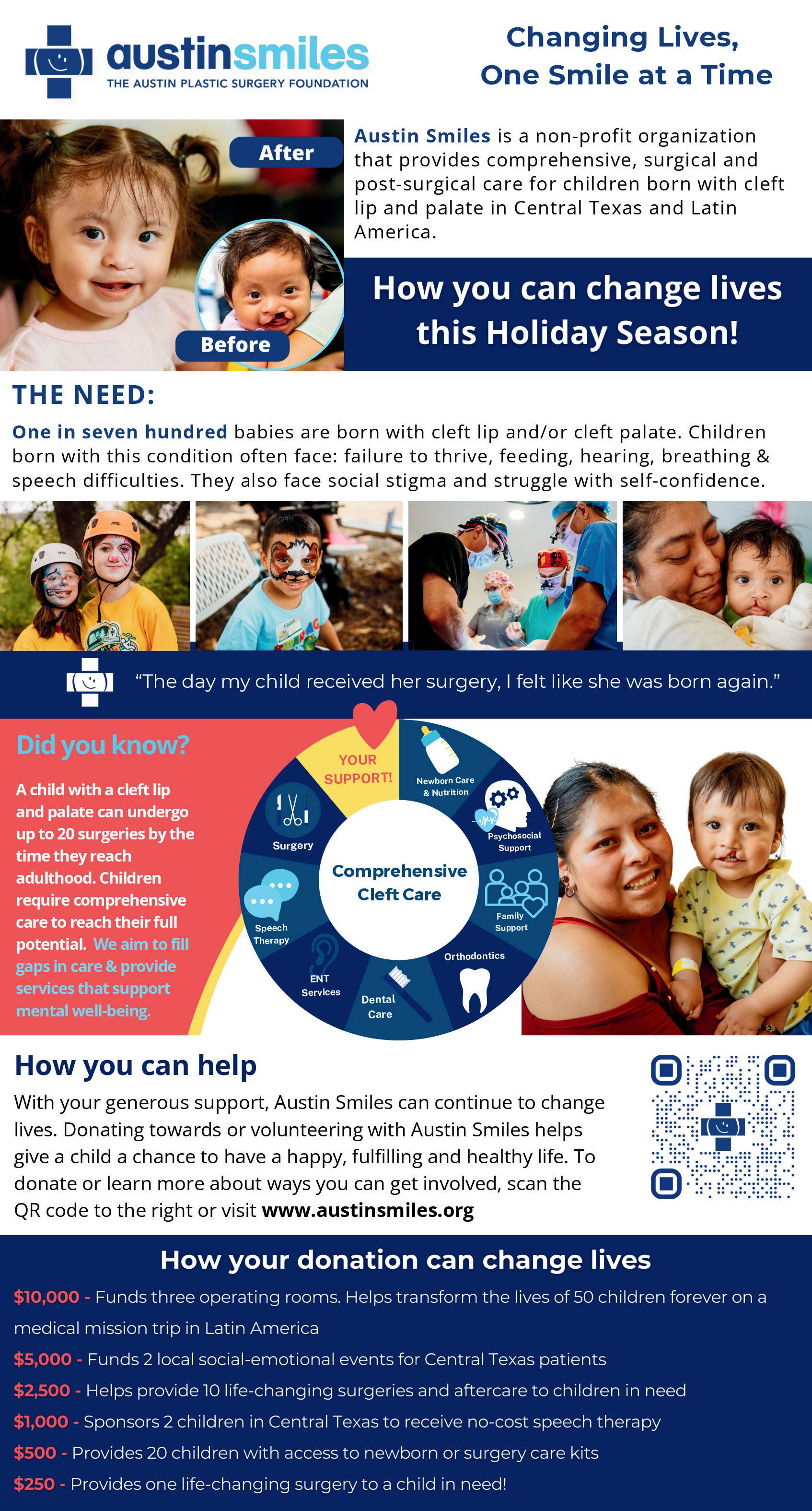 Every year, Austin Smiles conducts 3 medical mission trips to Latin America, providing over 50 surgeries per trip and offering follow-up support, dental services, and speech therapy to around 150 children with cleft lip and palate. Locally, Austin Smiles serves over 800 patients annually in Central Texas, providing social and emotional programming, nutrition support, parent support groups, speech therapy, advocacy, and preventative dental care.