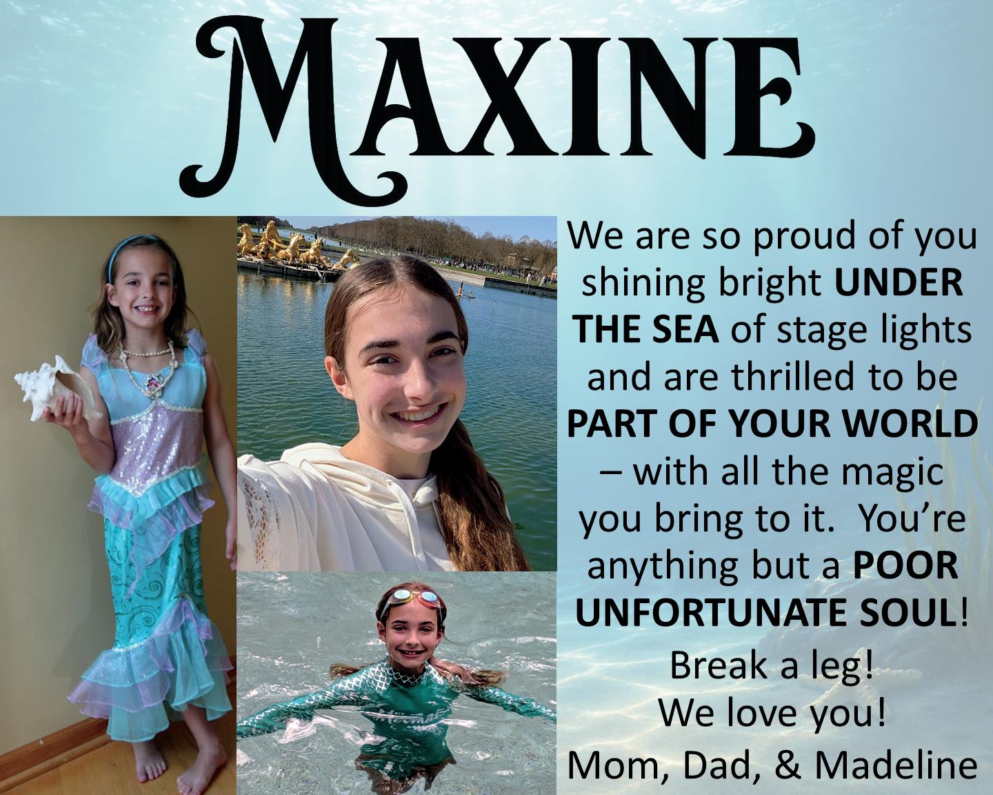 Audrey Klein (Carlotta, ensemble) is an 8th grader at WCS. She is thrilled to be in this year ' s production of The Little Mermaid Jr. Some of her past work includes Mary Poppins Jr. (Ensemble), The Best Christmas Pageant Ever (Imogene Herdman), Miss Nelson is Missing (Lavita), Clue (Motorist, ensemble), and two One Acts. She has also participated backstage in Freaky Friday Jr. and The Wiz!. Audrey would like to thank her mom, friends, and God for getting her where she is today She hopes you enjoy the show!