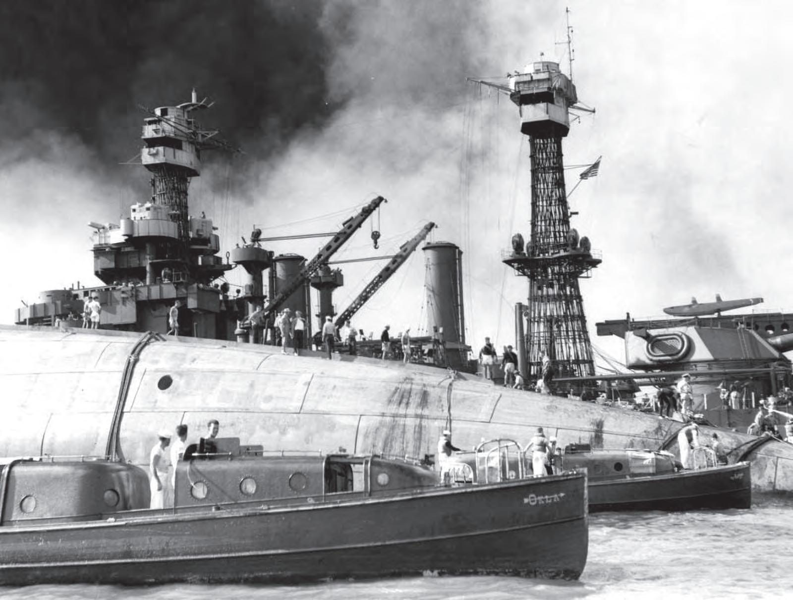 Rescue teams at work on the capsized hull of the U.S.S. Oklahoma, seeking crew members trapped inside, on Dec. 7 1941. The starboard bilge keel is visible at the top of the upturned hull. Officers' motorboats from the Oklahoma and the U.S.S. Argonne are in the foreground. The U.S.S. Maryland is in the background. U.S. Navy / National Archives, File