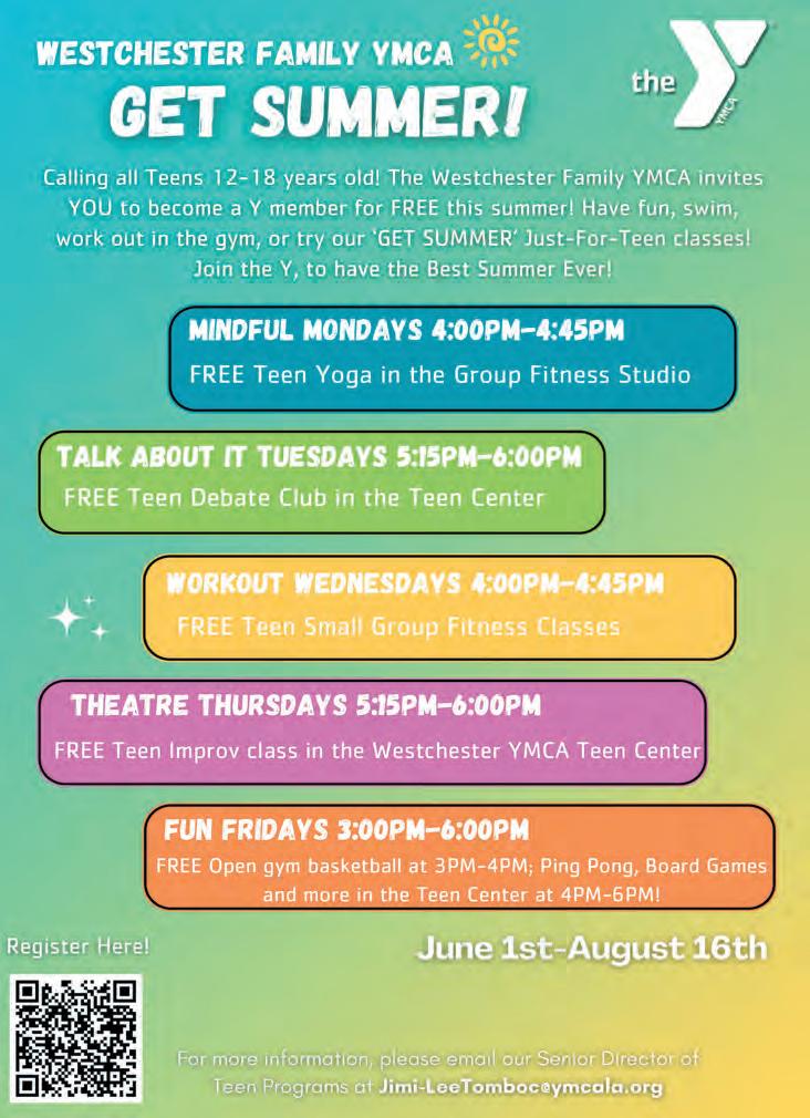 The Westchester Family YMCA is inviting all teens ages 12 to 18 to become a member for free this summer! Now through August 16, parents can register their teens at the Y, who can then start enjoying all the center has to offer, from swimming and workouts to special events and more! The “Get Summer” schedule also includes yoga on “Mindful Mondays,” a teen improv class on Thursdays and game-focused “Fun Fridays” in the teen center. Register at ymcala.org/getsummer to enjoy all the programming at the Y, and don’t forget to check out the Y’s camp schedule for a chance to explore the great outdoors and add some adventure to your vacation