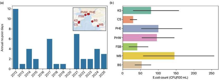 • Top plots show (a.) number of ‘poor’ water quality days by location and (b.) E. coli counts (colonies per 100 mL) at locations around Plymouth Sound (incl. Wembury).