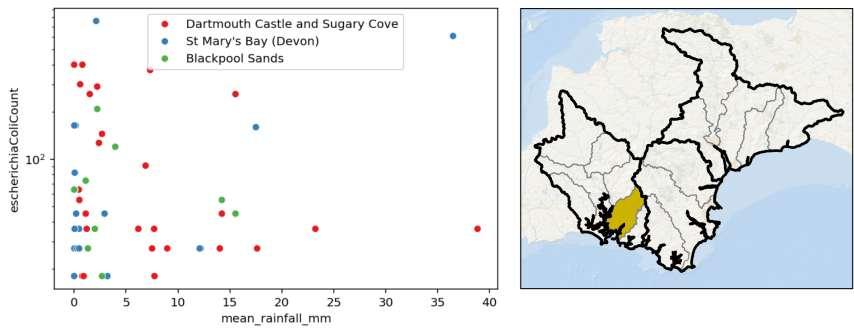 • Bottom plot shows the relationship between daily mean rainfall (mm) and E. coli counts at Plymouth Hoe East, Bovisand, and Firestone Bay.