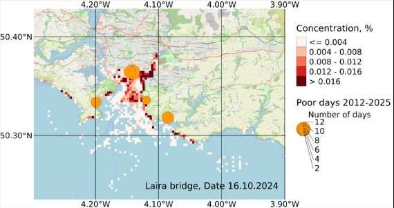 • Significant numbers of E. coli (indicated as deep red pixels) occur on tourist beaches (Jenny Cliff, Bovisand, Wembury) to the south-east and related to poor water quality days.