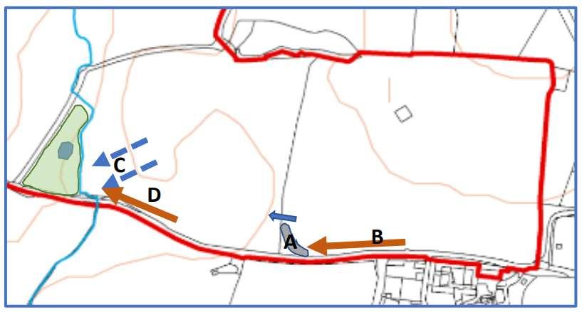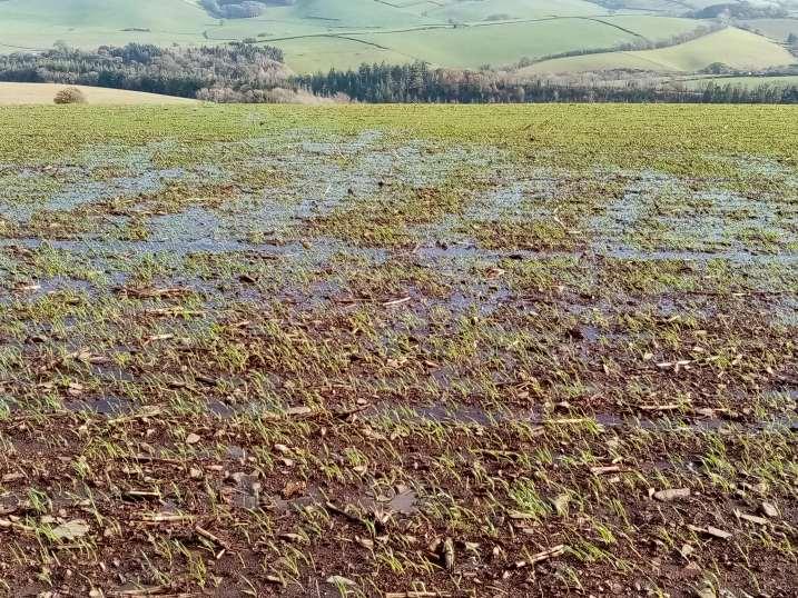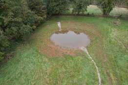 4. Rapid Response Catchment Natural Flood Management project funded a cross-track drain to divert runoff from a public footpath into nearby fields. The varied vegetation slows the water, promoting soil infiltration. A wetland and pond at the bottom of the field helps to slow the flow and retain water within the catchment.