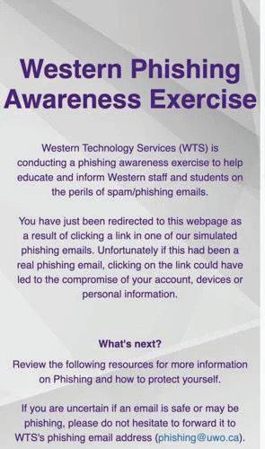 Students who clicked the link were then directed to a message from WTS informing the recipient they were conducting an exercise in phishing awareness to educate Western’s students and sta on phishing emails.