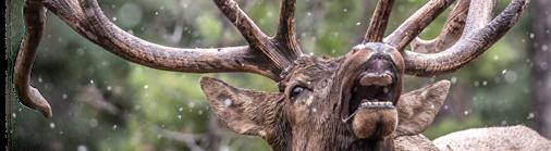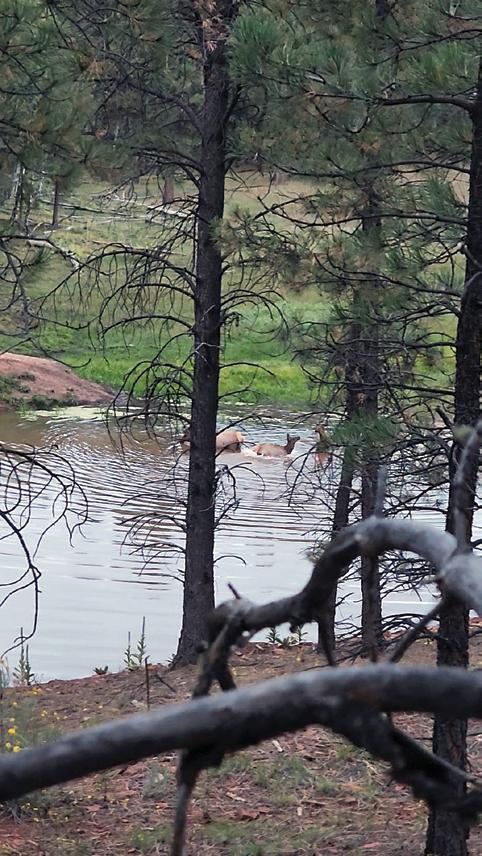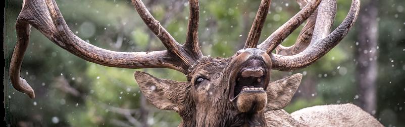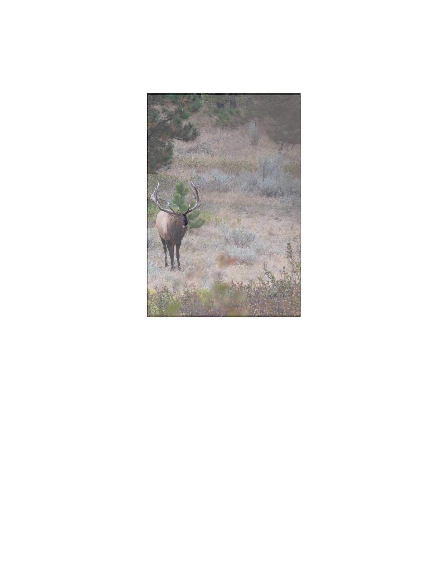 hides emerged as a few elk worked their way into the open. A huge herd bull materialized, tilting his head side to side to avoid his antlers contacting the trees. I quickly took a few shaky long-distance photos of the super wide bull with long white G-4 tines. My heart punched my sternum as a blanket of warm adrenaline filled my veins.