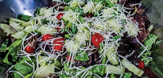 A variety of greens, cranberries, baby tomatoes, cucumber, and parmesan cheese add great flavors and micronutrients to this meal.
