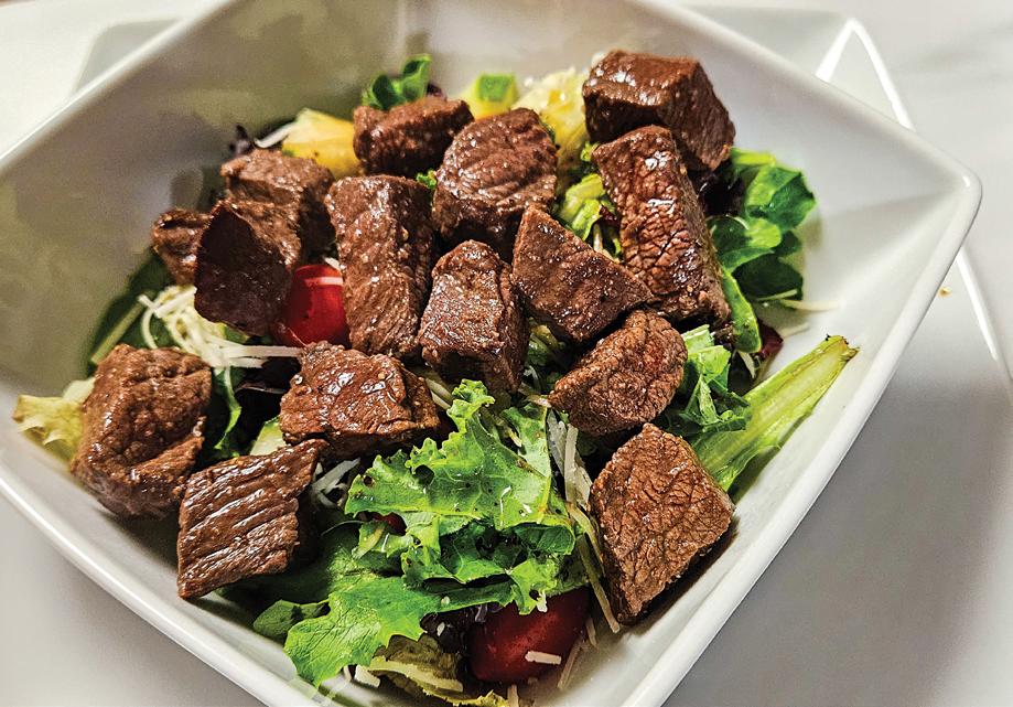Mix the salad ingredients well before topping with the bite-sized steak pieces.