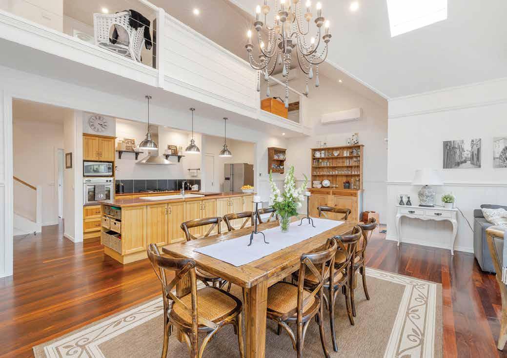 with built-in bench seating. A stroll through the wisterialaced arbour reveals the beautiful 85-year-old cedar barn that has been cleverly converted, on the upper level, into a one-bedroom loft apartment with modern ensuite, kitchenette and balcony. To the ground floor is a huge tavern-style games room with recycled brick floors and a cracking pot belly stove, and perfect for extended family or guests is a fifth bedroom and additional bathroom. Other outbuildings to the property include a double carport with roof storage, machinery bay and a workshop.n