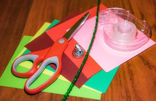 Tape the chocolate kiss in the center of the flowers. Double up the green pipe cleaner and tape both ends to the back of the bouquet to serve as a handle.