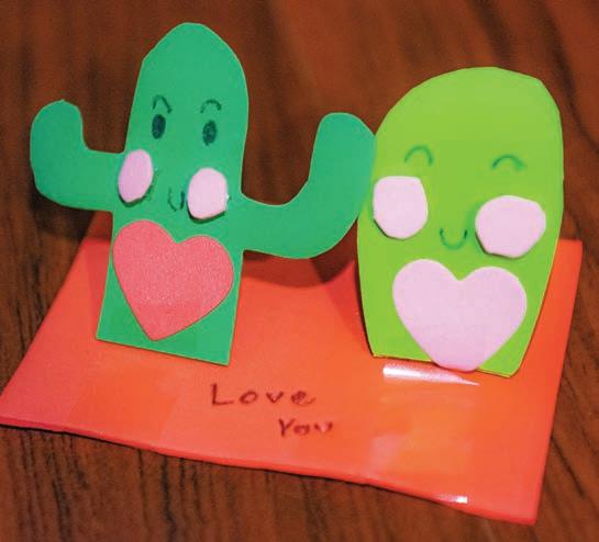 Tape the cactus shapes to the red foam paper. Place the heart stickers on the cactuses. Draw eyes and mouth on the cactuses. WGW