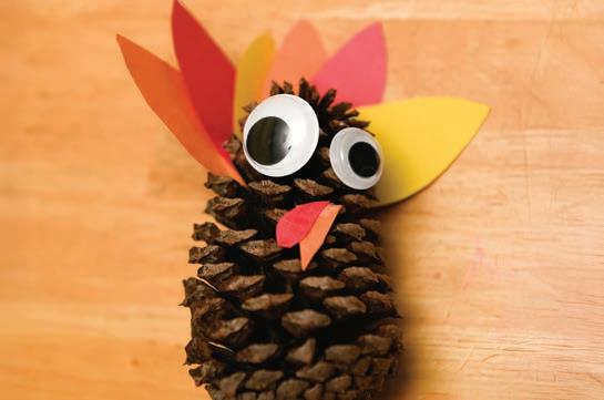 Glue the feathers to the back of the pinecone so they fan out like a turkey’s tail.