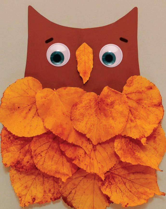 Cut the shape of an owl from the construction paper. Glue the leaves and googly eyes in your