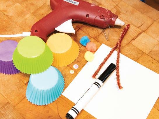 Glue the pom poms and the cupcake liner shapes to the top of the puppet.