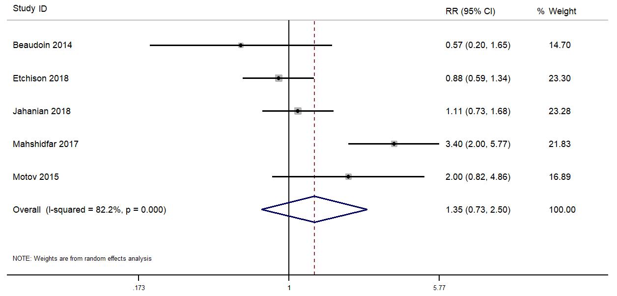 Five studies reported on the difference in need for rescue analgesic medication between the ketamine and control groups. The pooled RR was 1.35 (95% CI 0.73- 2.50; I2=82.2%), indicating no significant difference in need for rescue analgesics between the ketamine and control groups (Figure 3). Sensitivity analysis did not reveal any significant difference in the magnitude or direction of association because of small-study effects (Supplementary Figure 6). Analysis based on the dose of ketamine did not show significant effect at any of the doses ranging from 0.1-0.5 mg/kg. Analysis based on the control group was not possible as all the studies (except Etchison et al 2018) used morphine in the control group. The quality of evidence was found to be low as per the GRADE approach.