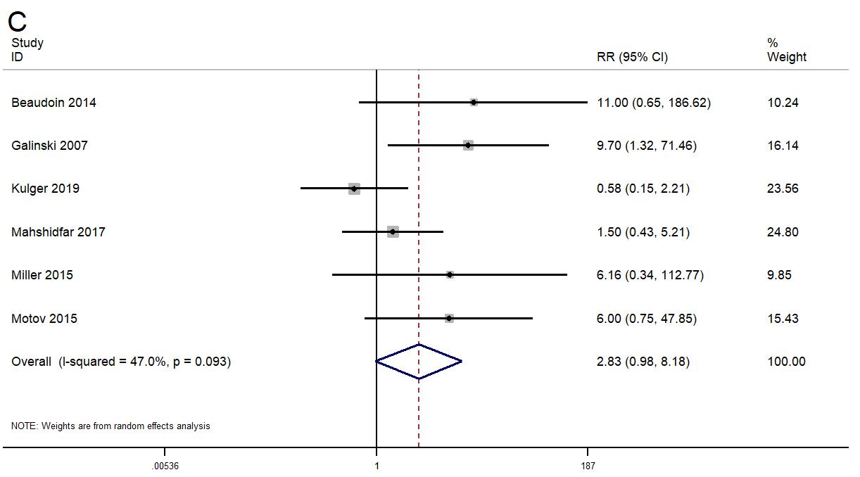 Six studies reported on the difference in psychological side effects (delirium, hallucinations, and mood changes) between the ketamine and control groups. The pooled RR was 2.83 (95% CI 0.98-8.18; I2=47%), indicating no significant difference in psychological side effects between the ketamine and control groups (Figure 4C). Subgroup analysis based on the route of administration, dose, or control group did not reveal any difference in terms of magnitude or direction of association. The quality of evidence was found to be low as per the GRADE approach.