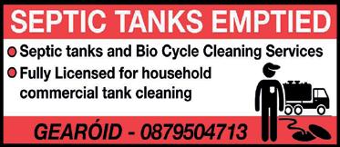 Septic Tank emptying, bio - cycle tanks desludged, cleaned & checked. Toilets - drains unblocked. Gearóid Mac Gearailt. 087-9504713 / 087-2390018