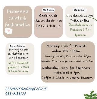 Additional Instruments Ukulele, Tenor Banjo, Mandolin, Percussion Junior and Leaving Cert Practical Preparation Contact us on 0863311215 Now Enrolling Trial Lessons Available DINGLE SCHOOL OF MUSIC Natural Healing Clinic Fertility, Gynaecology, Pediatric, Injury, Stress 086- 6066865 www.redlotusclinic.com Clinics in Dingle, Castlegregory & Tralee Eithne Griffin, Lic.Ac., CSTT, DIPHom Acupuncture, Craniosacral Therapy, Homeopathy, Reflexology, Massage. Kiln Dried Firewood Hardwood - Ash Softwood - Spruce Text 087-2499602 leDéiseAbú 4 14 5 12 ́ ́ 216 á,é,í,ó,ú ḃ,ċ,ḋ,ḟ,ġ,ṁ,ṗ,ṡ,ṫ 7Ant-amaṫógannsédondoṁancasaḋara 10Paráıd,líonmórḋaoıneeagraıṫeınaonlíne 13Cumasfaoıleıṫatáagforṁórnan-éan(6) 14Ant-éanaruguḃórga,deréırfaḃalscéıl 1Tarṫarn-aısgodtíanáıtċéanna(4) 3Antréıṁseroıṁéırínódulfaoınagréıne(9) Réiteach Uimhir216 F U I S C E U M I S L T A L Á É A D R O M L C P I Ó M Ó R Ṡ I Ú L N S O R B E I T I L T G É A A A N A D I A S P A I L 216 Tagairtinmheánach: CDBeo_9x9D_19 CrosfhocalSean-nóis Uimhir217 leDéiseAbú 5 6 7 9 10 12 1 2 3 4 8 11 ́ ́ ́ ́ ́ 217 ́ = Síneaḋfadaarġuta, á,é,í,ó,ú • = Consanbuaılte, ḃ,ċ,ḋ,ḟ,ġ,ṁ,ṗ,ṡ,ṫ