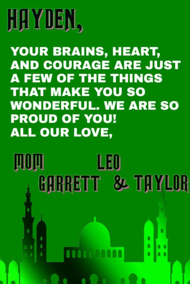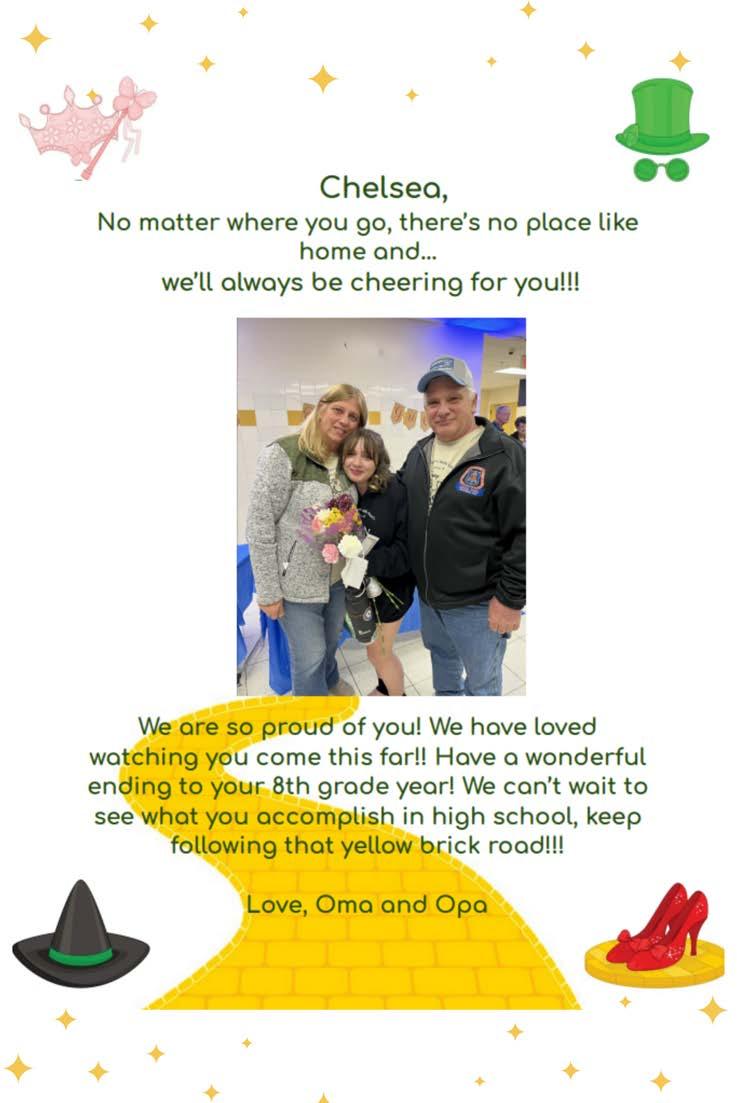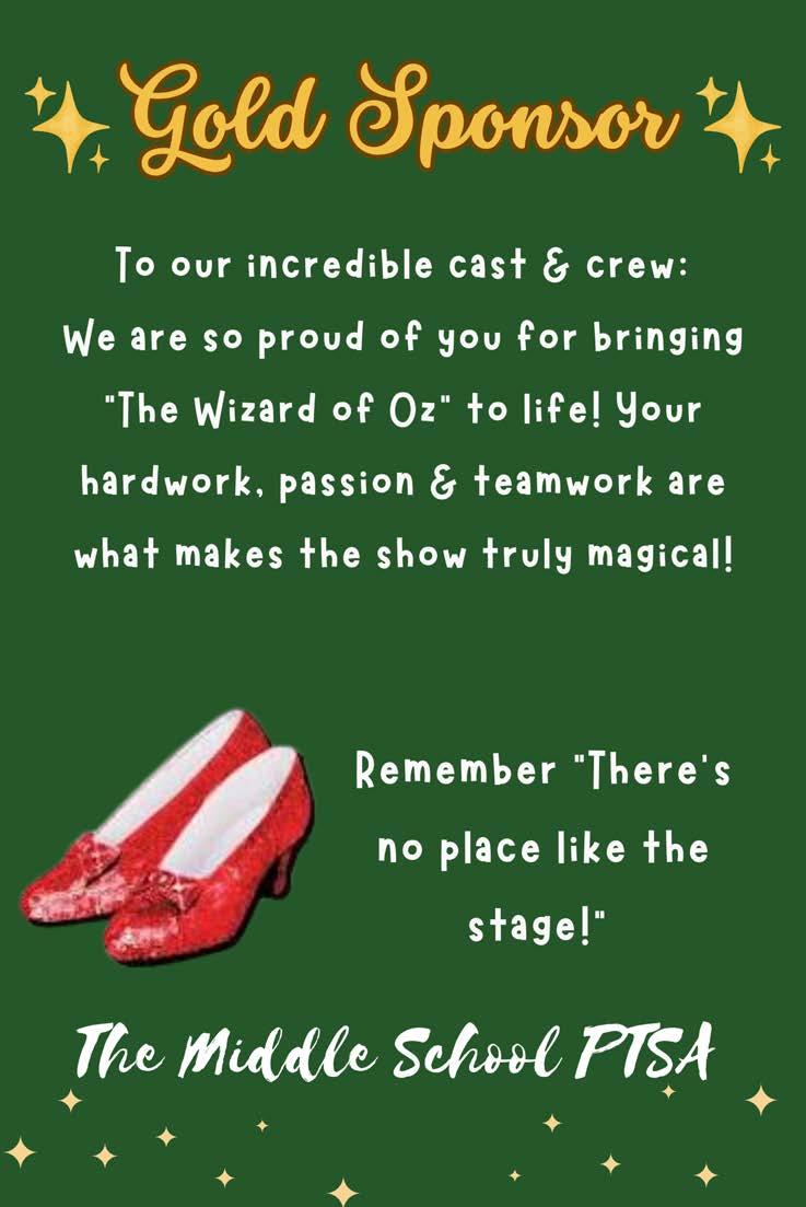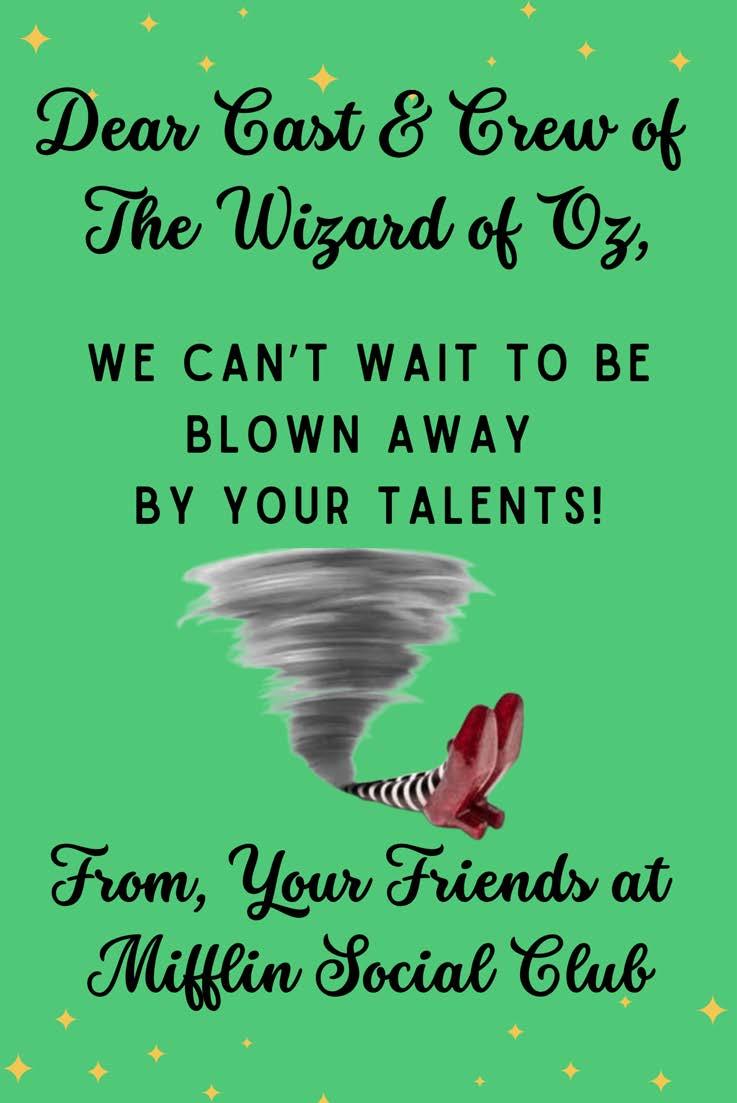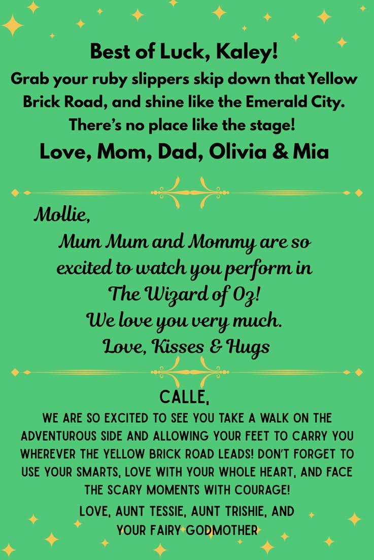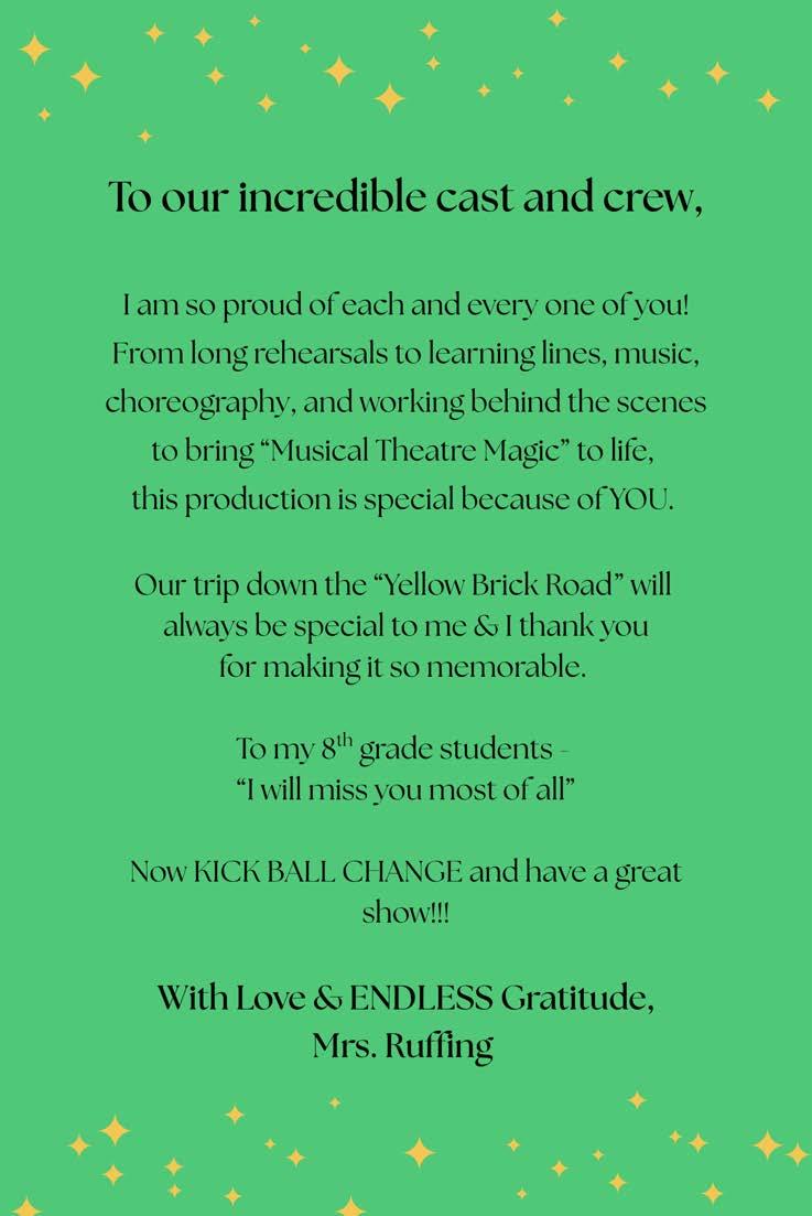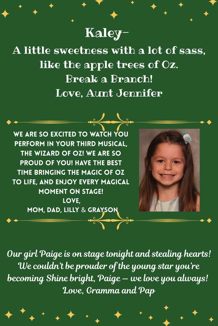 Hayden Kearns (The Wizard/Coroner) Hayden is in her third musical at the middle school! She is an 8thgrade member of the Drama Clubandparticipatesin Chorus.She’dlike to thank her mom, her grammy, her brothers, her boyfriend, Kevin Squires, Mrs.Ruffingand those who helped with theshow!!