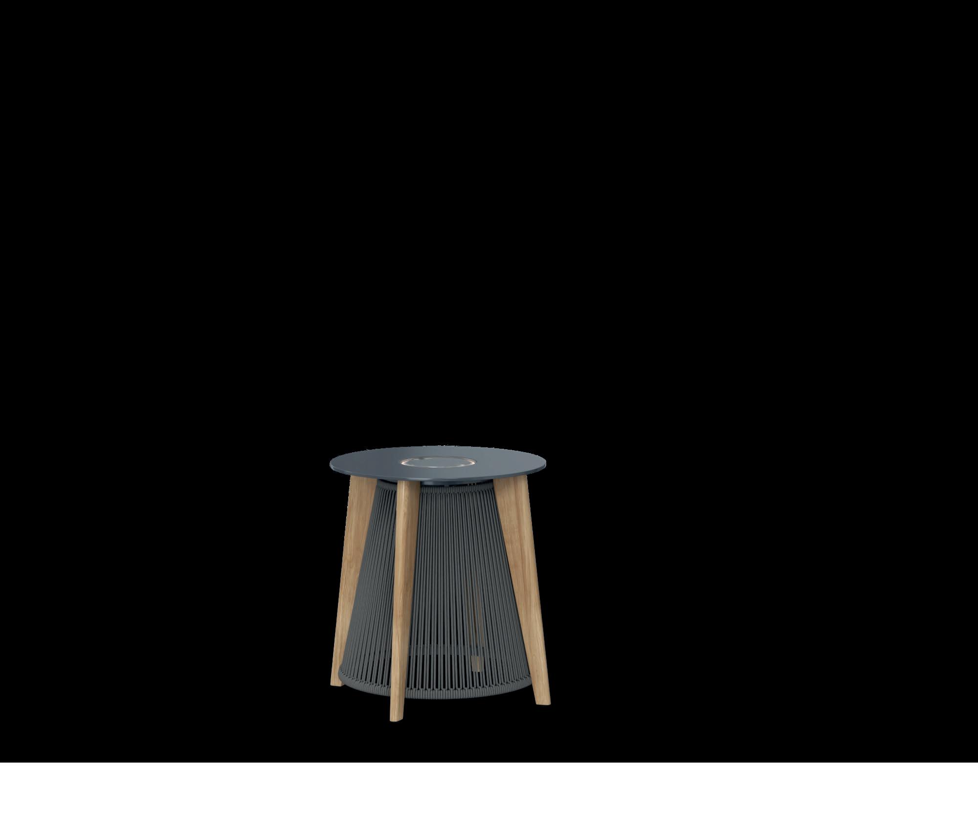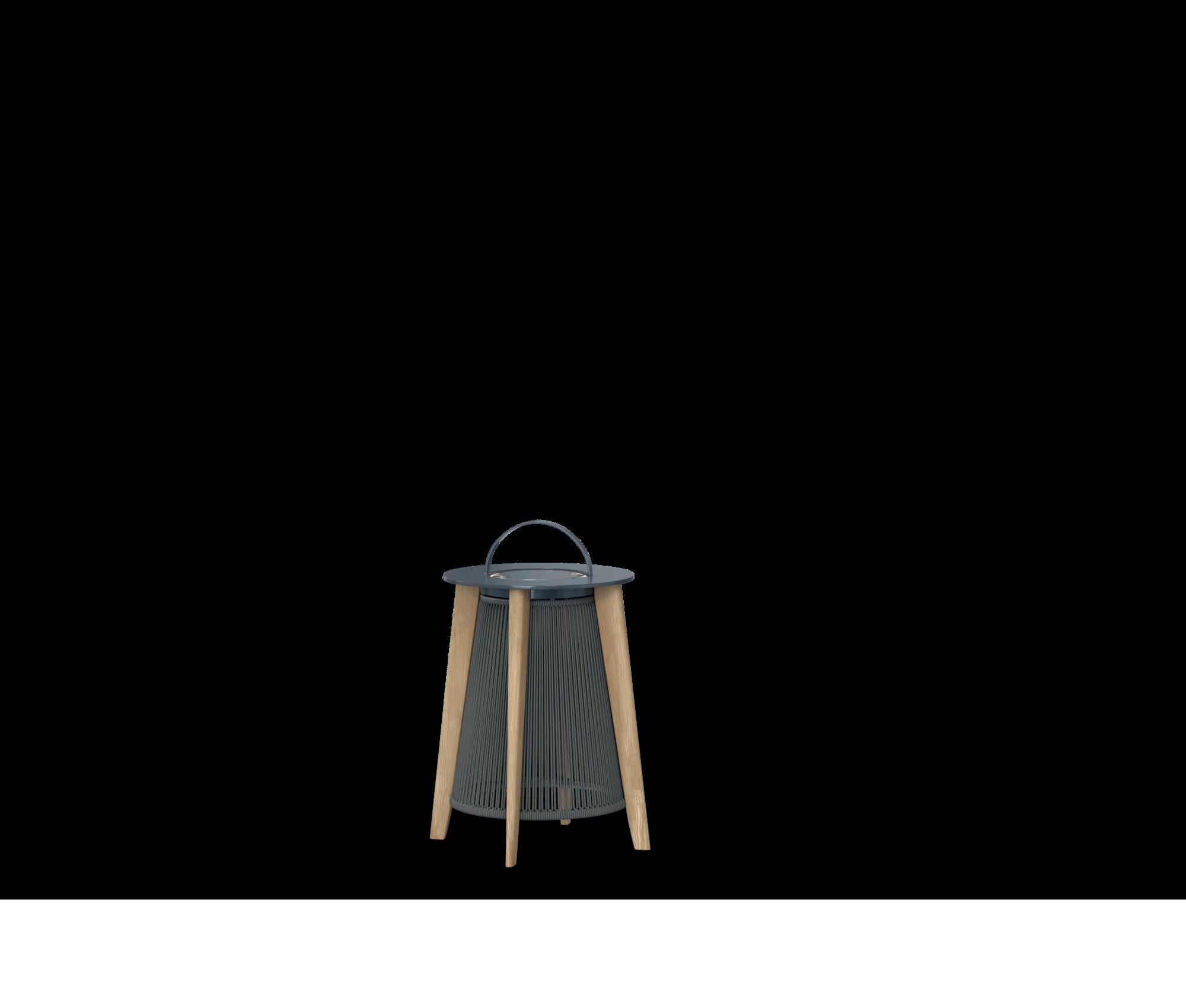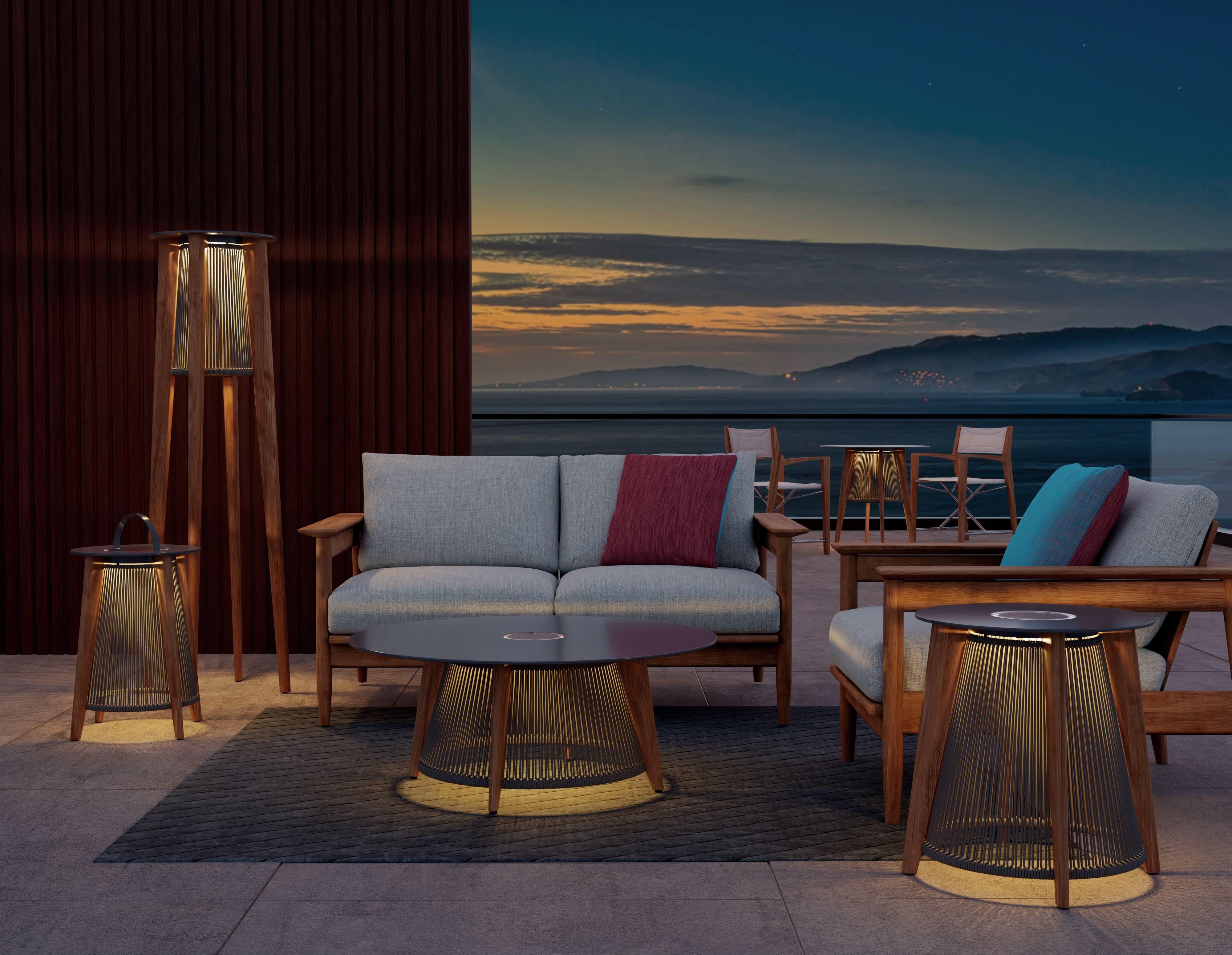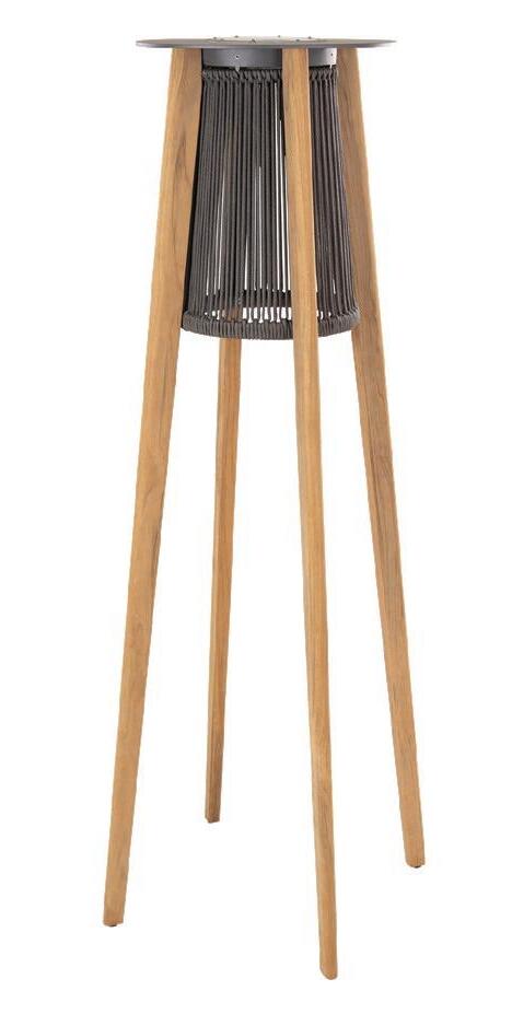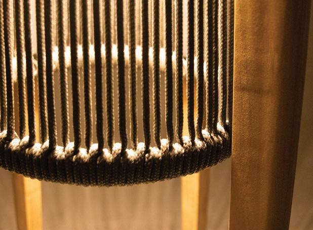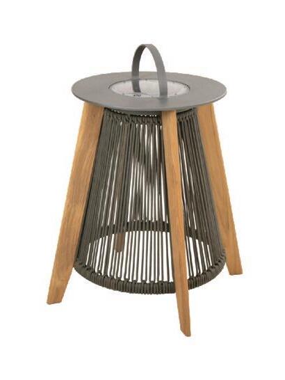 Close-up of all-weather rope weave on teak and aluminium frame. Light source: 600 lumens solar-powered LED w/remote control (dimmable in 3 settings).