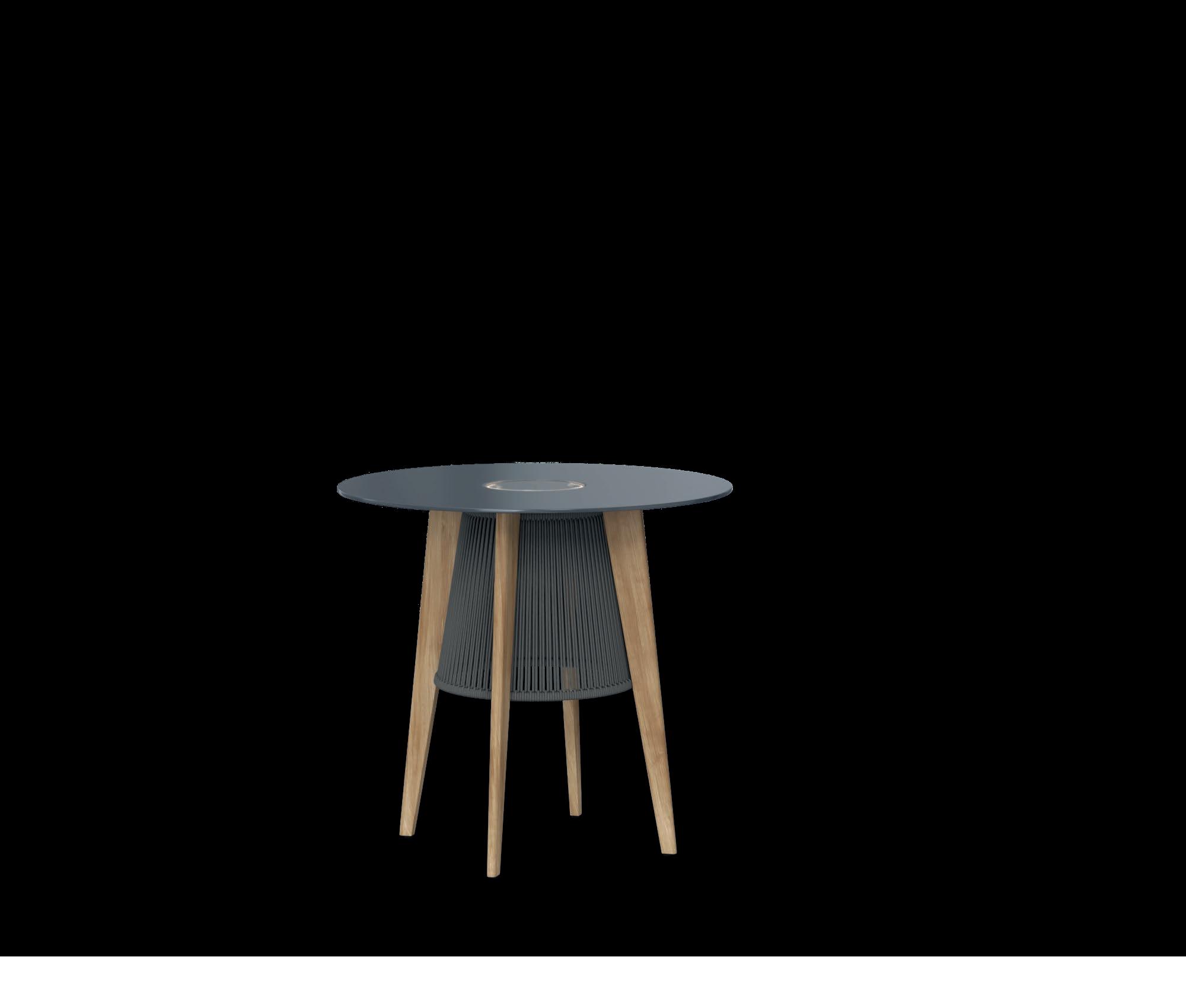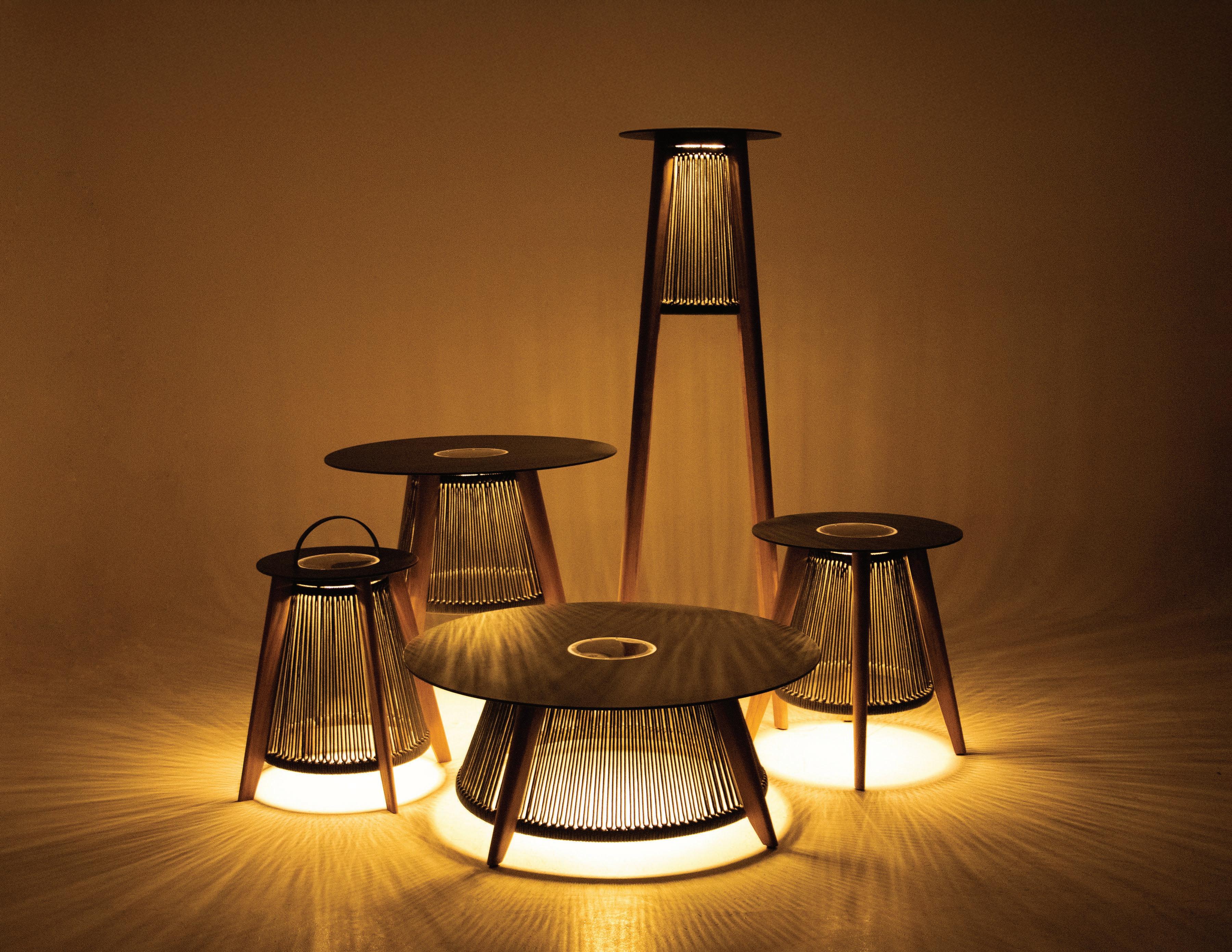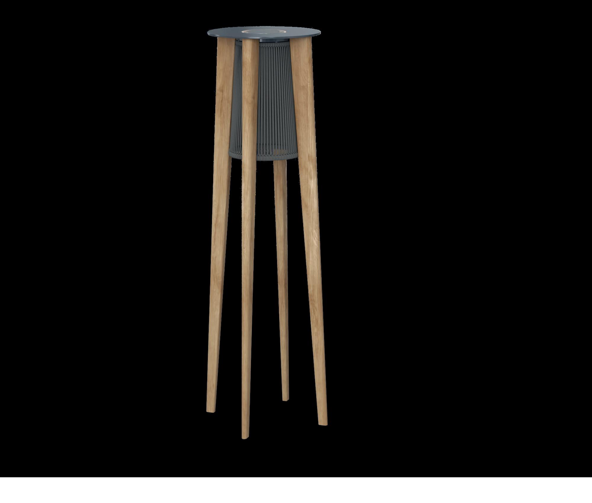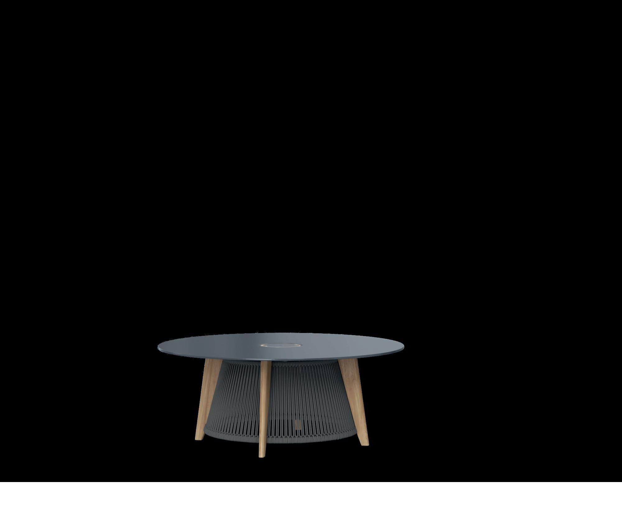 Close-up of all-weather rope weave on teak and aluminium frame. Light source: 600 lumens solar-powered LED w/remote control (dimmable in 3 settings).