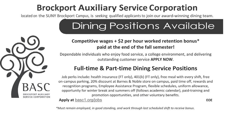 2 Westside News East and West Editions - October 1, 2023 TRANSPORTATION Senior Automotive Mechanic (Full-time) FORAllPOSITIONS,APPly ONlINeAT: https://www.applitrack.com/brockport/onlineapp/ For Transportation questions, please call: (585) 637-1807 BROCKPORT CeNTRAl SCHOOl DISTRICT is accepting applications for the following position: FOOD SERVICE DEPARTMENT Food Service Helpers (Part-Time) 1 Position at 4.00 Hours Per Day 4 Positions at 5.75 Hours Per Day FORAllPOSITIONS,APPly ONlINEAT: https://www.applitrack.com/brockport/onlineapp/ BROCKPORT CENTRAl SCHOOl DISTRICT is accepting applications for the following position:
