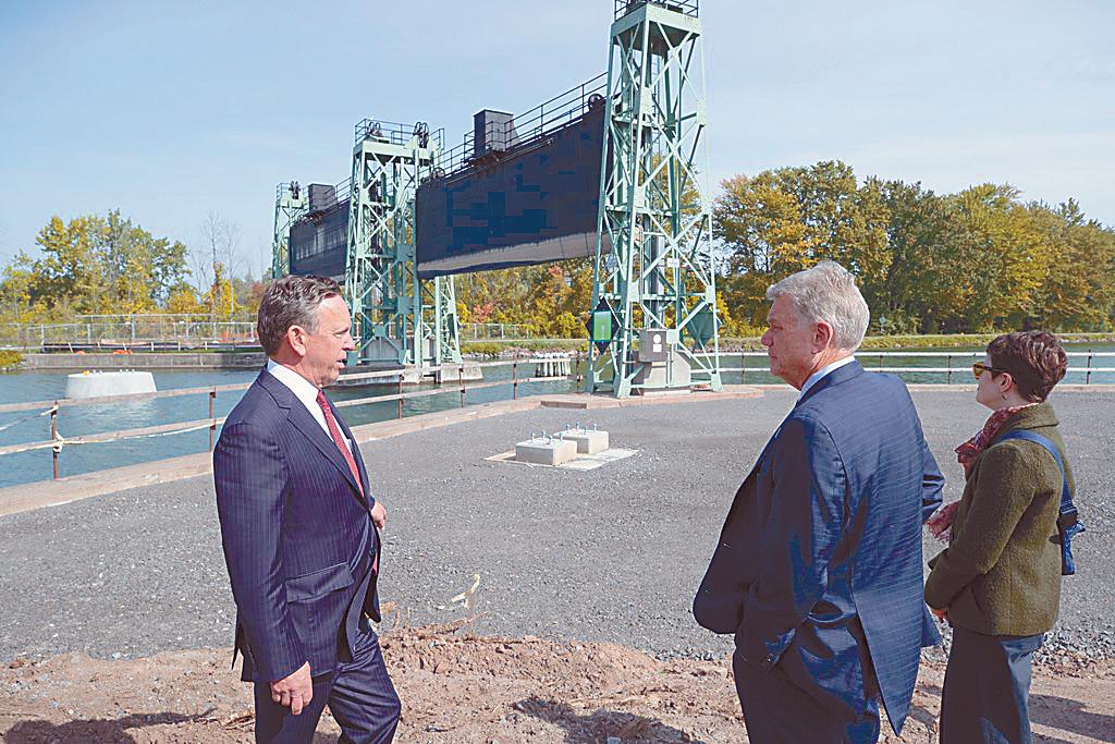 NYPA President and CEO Justin E. Driscoll, Canal Corporation Director Brian Stratton and Canals Angelyn Chandler look over the construction site of the new Brockport pedestrian bridge on the Erie Canal after the Board of Trustees meeting held at SUNY Brockport.(Philip Kamrass/ New York Power Authority)