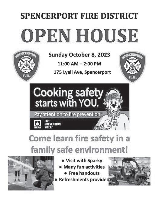 •Open House at Spencerport Fire District, 175 Lyell Avenue, Spencerport, on Sunday, October 8, from 11 a.m. to 2 p.m. The event features a school Safety bus, RG&E on-site with public education, Monroe Count Impact Team, Gates Ambulance, Ogden Police, the Gates Hazard House, Monroe County Sheriff’s Office providing the child ID program, an exhibit of the SFD equipment and more. Free refreshments will be provided.