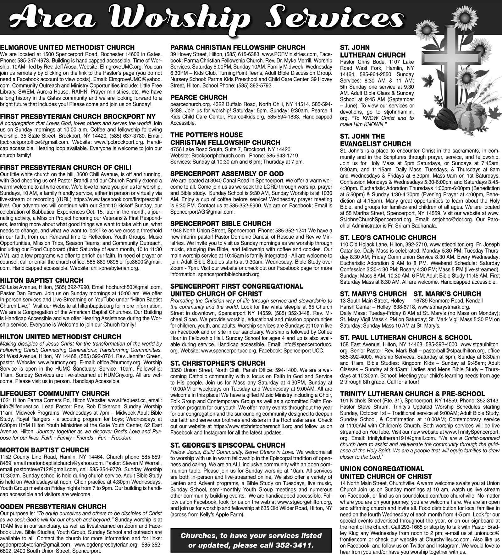 •The Brockport Ecumenical Food Shelf, located at 14 State Street in the basement of St. Luke’s Episcopal Church, is open for in-person shopping on the first four Thursdays of each month from 9 a.m. to 12:30 p.m. and 2 to 6 p.m. Masks required. Only one shopper allowed per family; bring shopping bags. Delivery, by appointment, for those who are unable to shop in-person. For information or to schedule delivery, call 637-8169.