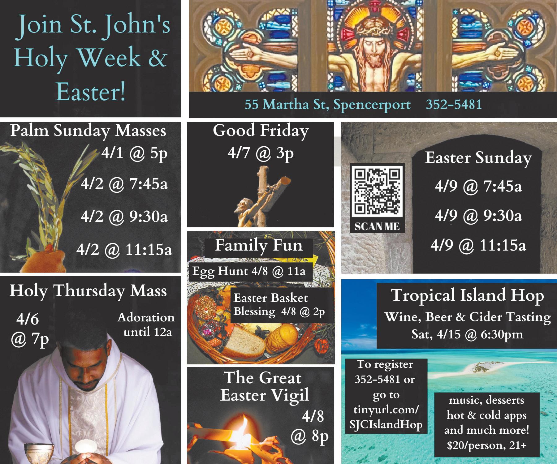 110 Old Hojack Lane, Hilton, 392-2710, www.stleohilton.org. Fr. Joseph Catanise. Daily Mass is celebrated: Monday 5:30 PM; Tuesday-Thursday 8:30 AM; Friday Communion Service 8:30 AM. Every Wednesday: Eucharistic Adoration 9 AM to 8 PM. Weekend Schedule: Saturday Confession 3:30-4:30 PM; Rosary 4:30 PM; Mass 5 PM (live-streamed). Sunday: Mass 8 AM, 10:30 AM, 6 PM (No 6 PM Mass on Easter Sunday); Adult Bible Study 11:45 AM. First Saturday Mass at 8:30 AM. Stations of the Cross – Fridays at 3 PM. All are welcome. Handicapped accessible.